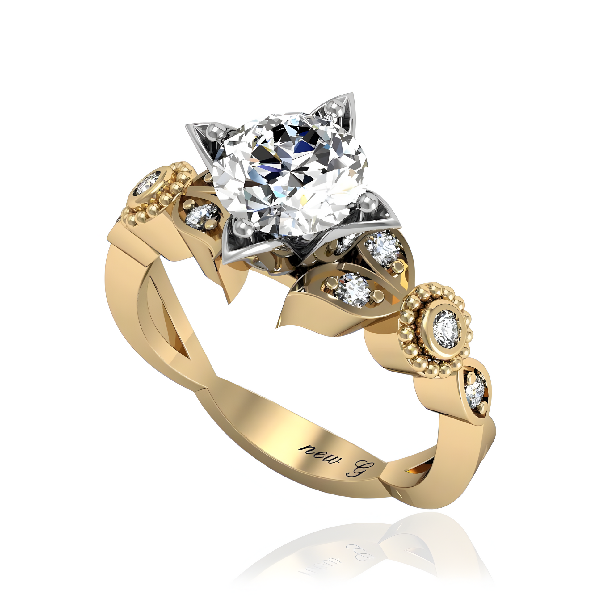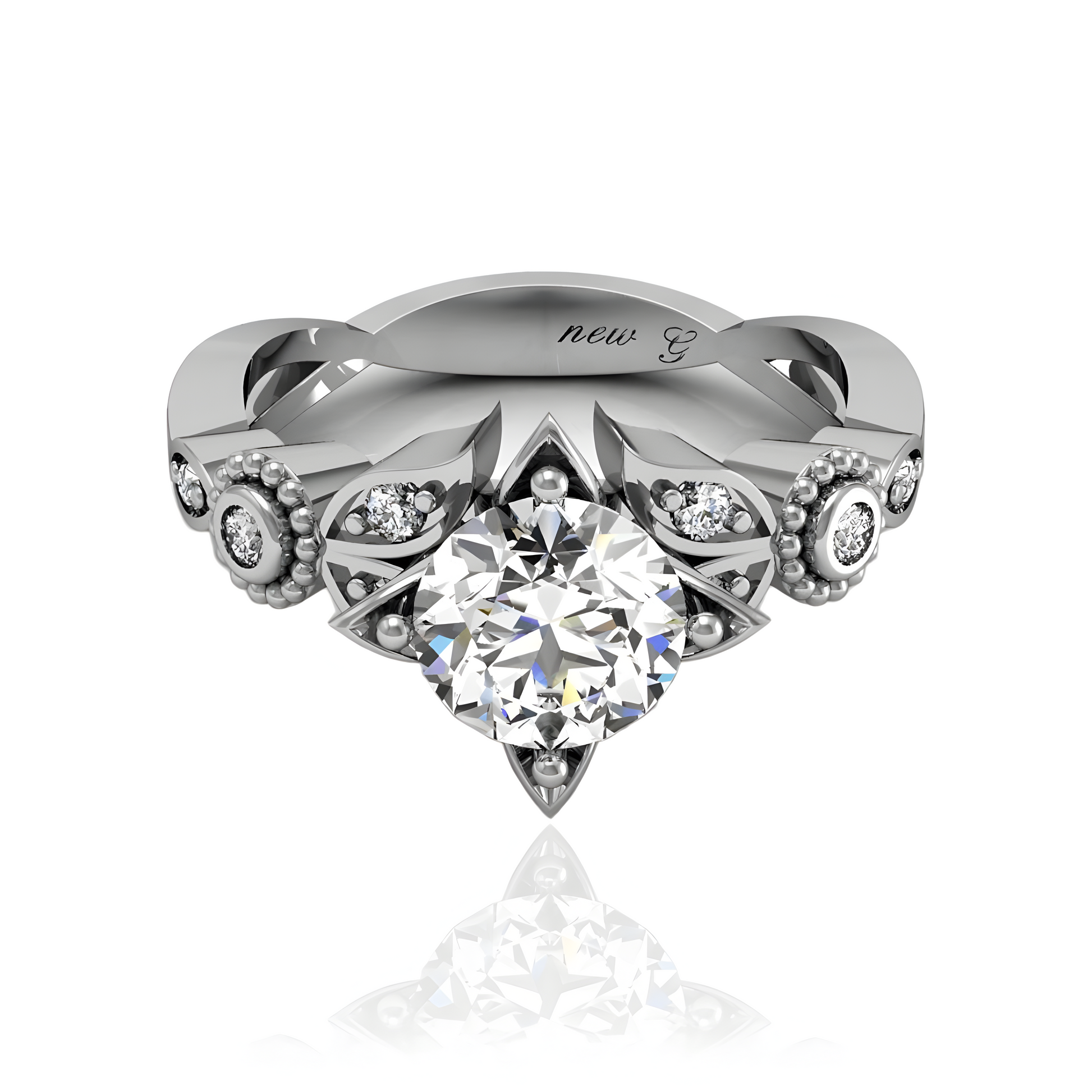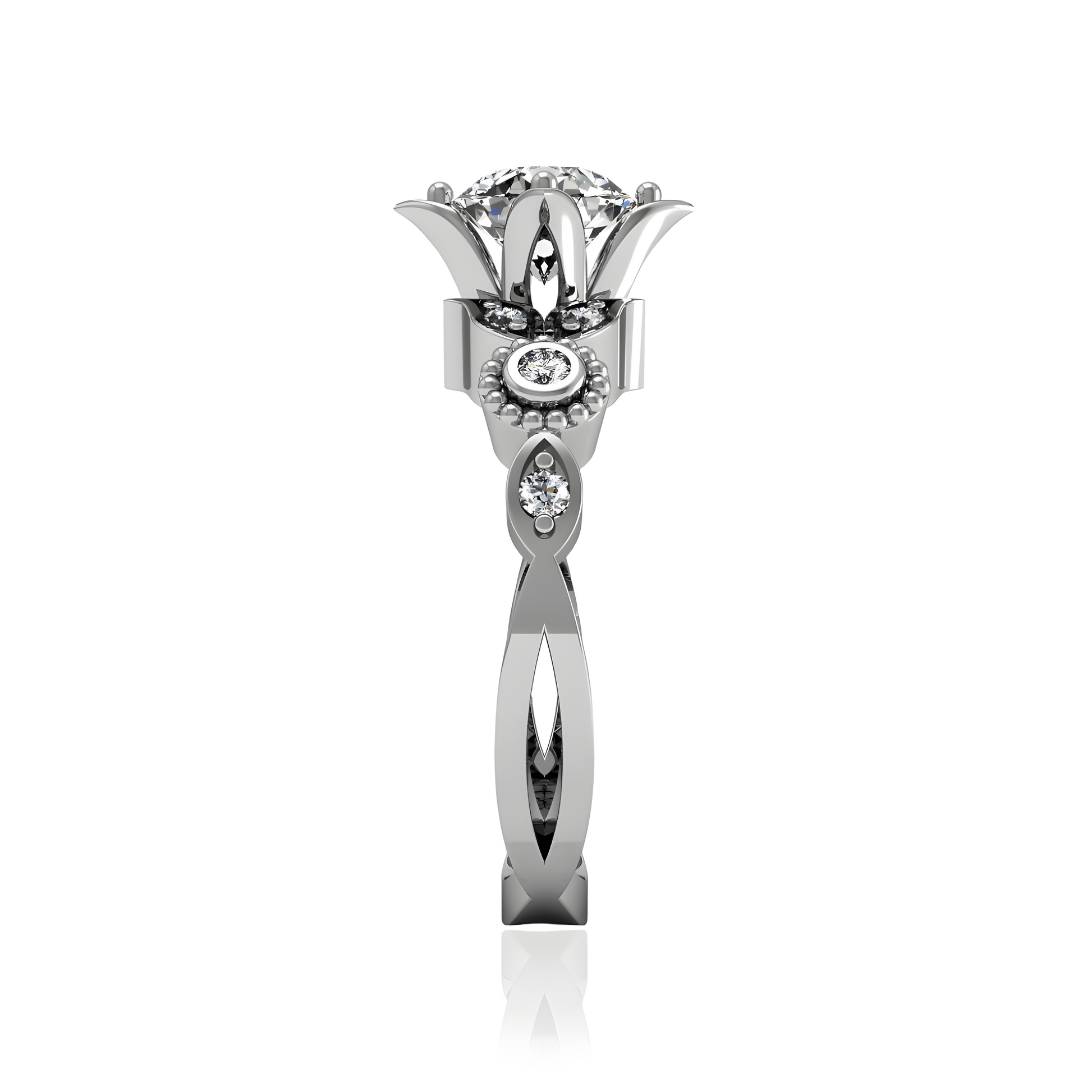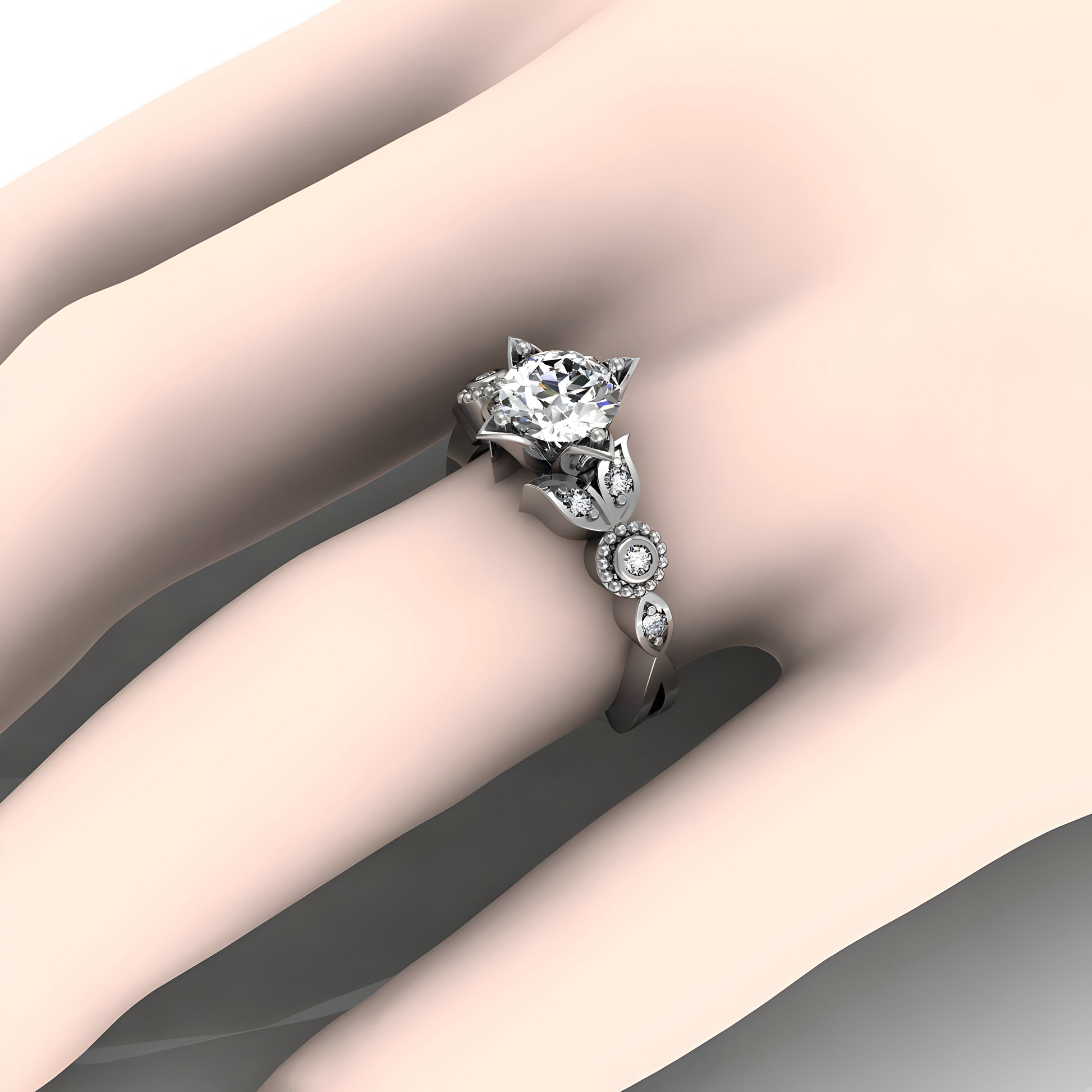 Unveil the magic of commitment with this exquisite floral-inspired engagement ring. Crafted meticulously in your choice of luxurious platinum, classic gold, romantic rose gold, or sleek white gold, this ring mirrors the delicate form of a blooming flower. At its heart lies a splendidly cut central diamond, available as a sustainable lab-grown diamond or a precious natural diamond, encapsulated by petal-like prongs that dazzle with embedded smaller diamonds. This enchanting design promises to be as enduring as your love, perfect for the bride who delights in a blend of elegance and contemporary flair.