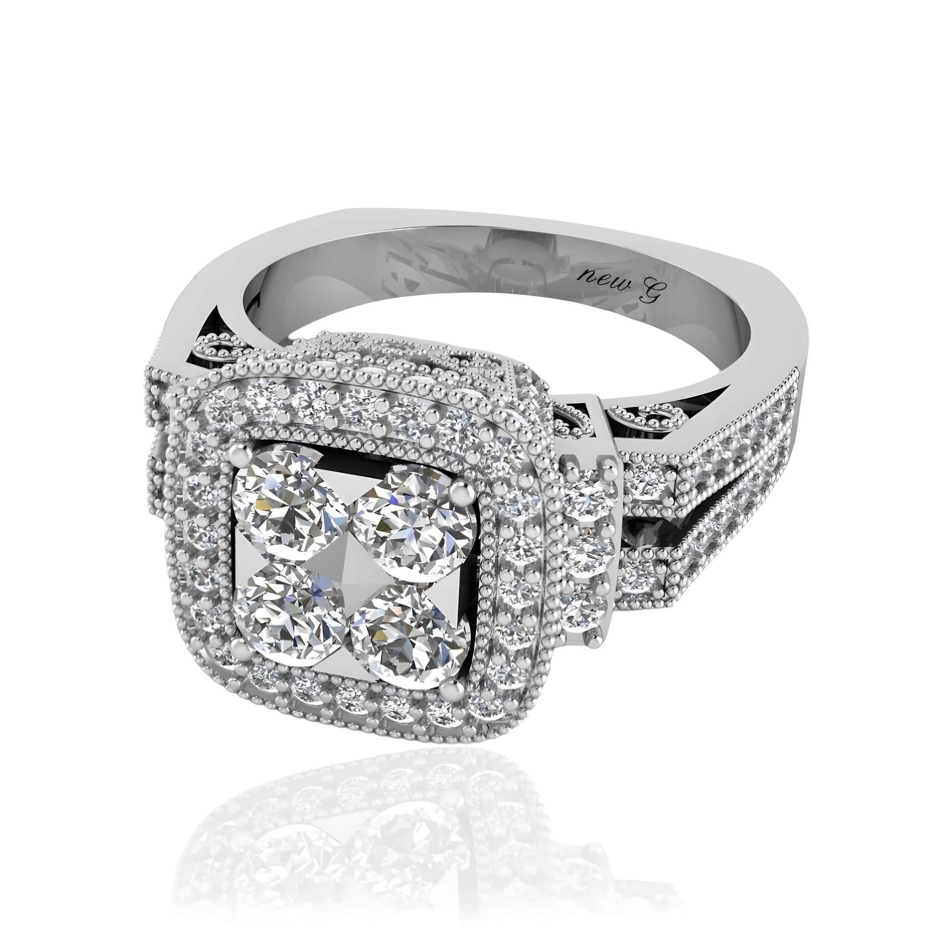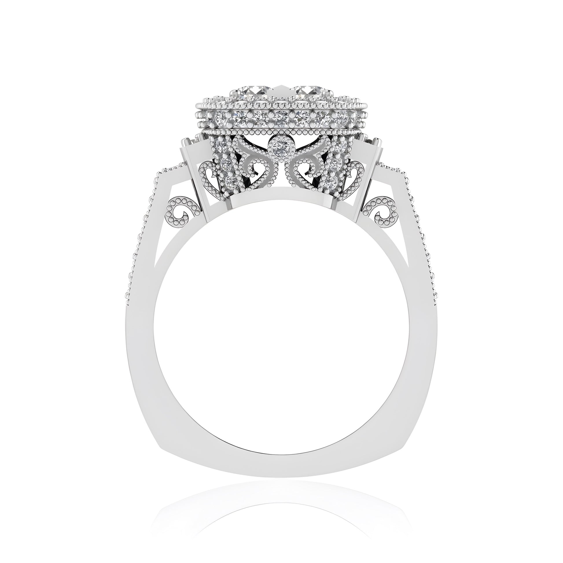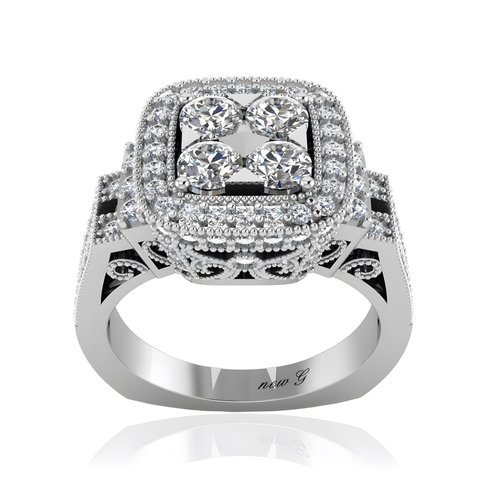 This stunning diamond-studded ring is a true testament to timeless elegance. Featuring an intricate design with 102 sparkling sidestones, this ring exudes a luxurious charm that will captivate anyone who lays eyes on it. The beautifully arranged diamonds shimmer brilliantly, creating a mesmerizing play of light with every movement.