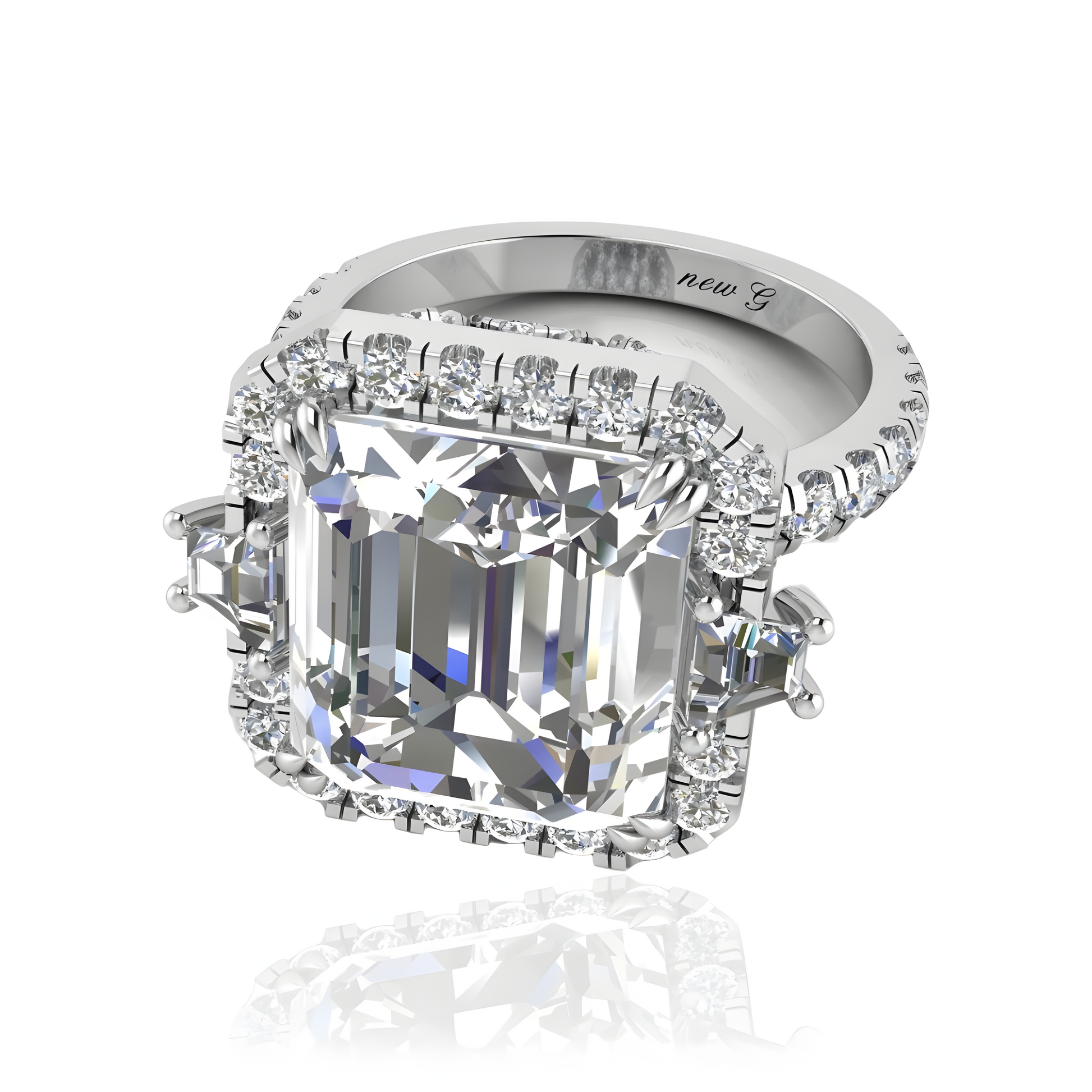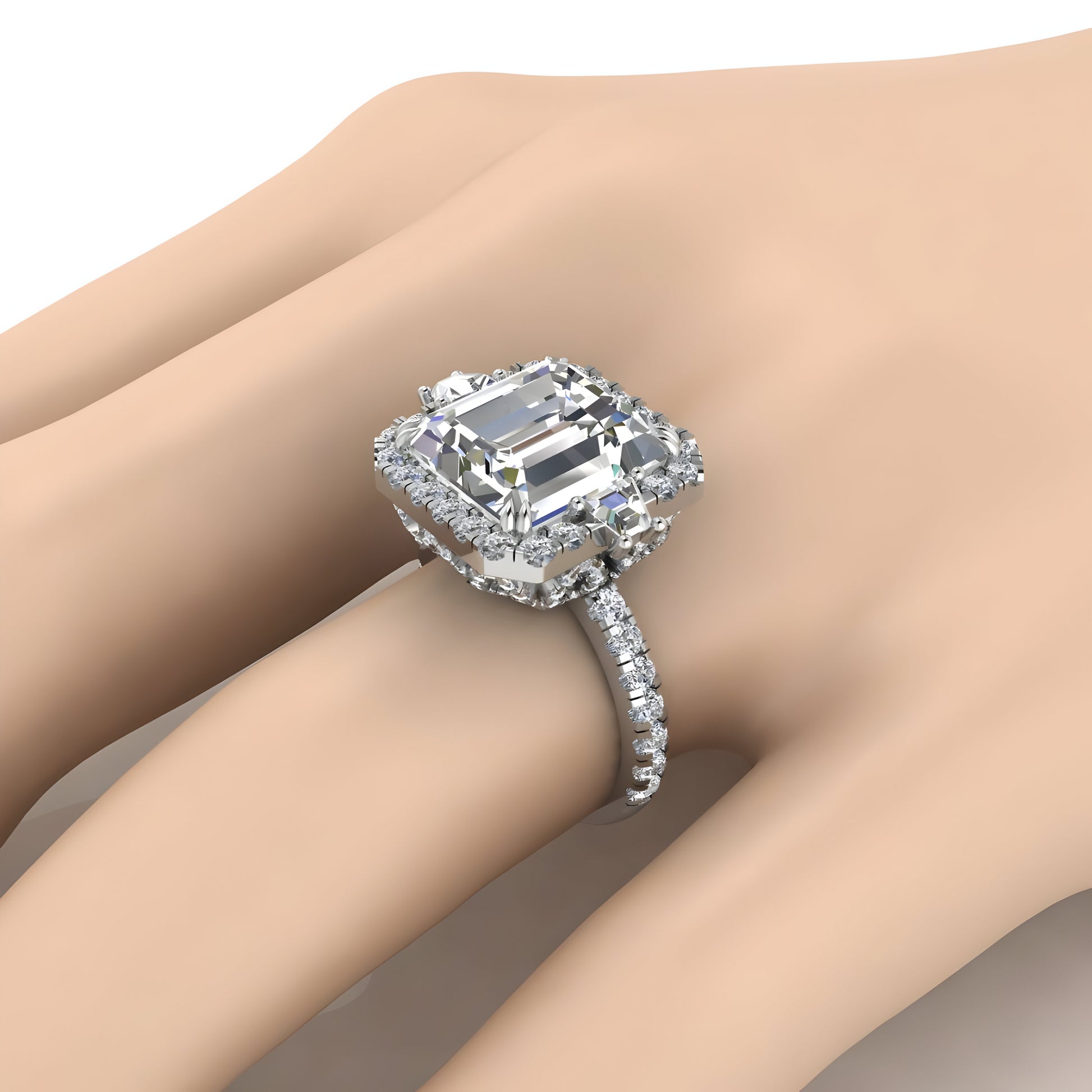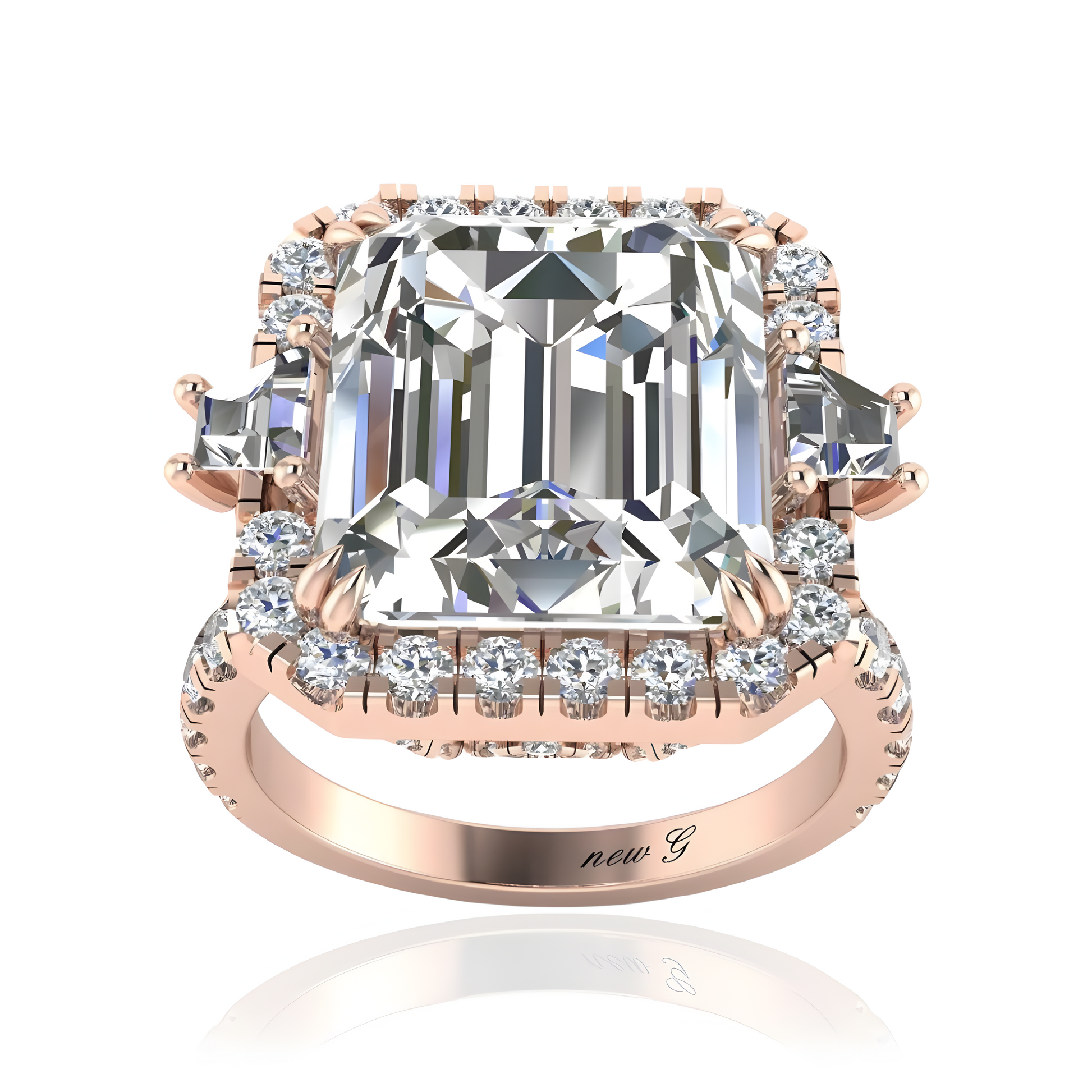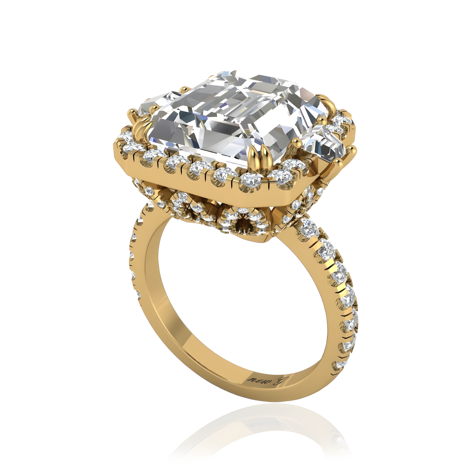 Exemplifying opulence and grandeur, the Imperial Splendor Diamond Engagement Ring is a masterpiece designed for those who love to make a statement. This ring, offered in gold, rose gold, white gold, or platinum, boasts a large, radiant diamond at its center, available as a lab-grown diamond for contemporary luxury or a natural diamond for classic charm. Encased in a bold, cushioned halo setting adorned with a multitude of smaller diamonds, this central gem is elevated by its spectacular brilliance. The band itself, also lined with diamonds, complements the lavish design, ensuring that every angle of this ring sparkles with majestic allure.