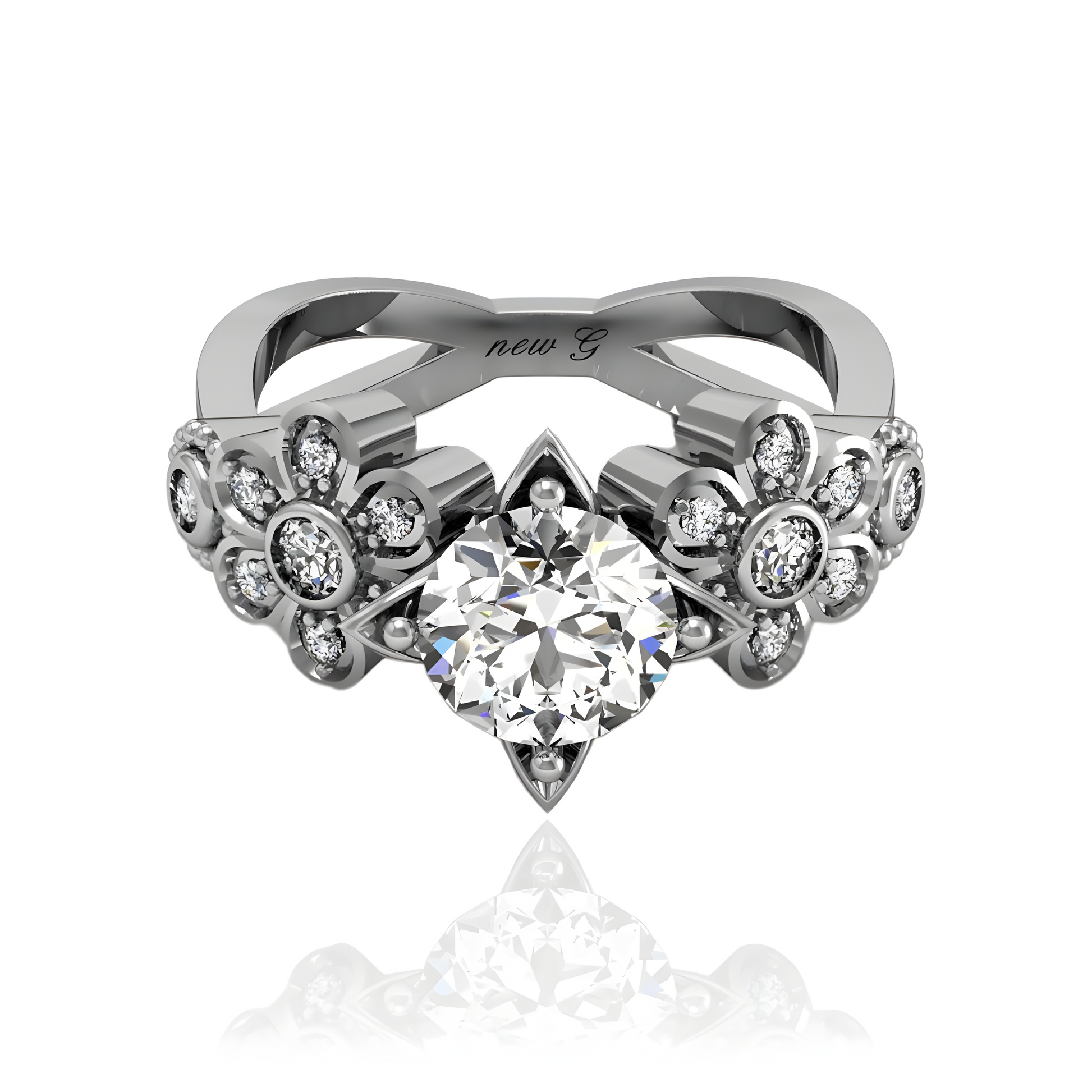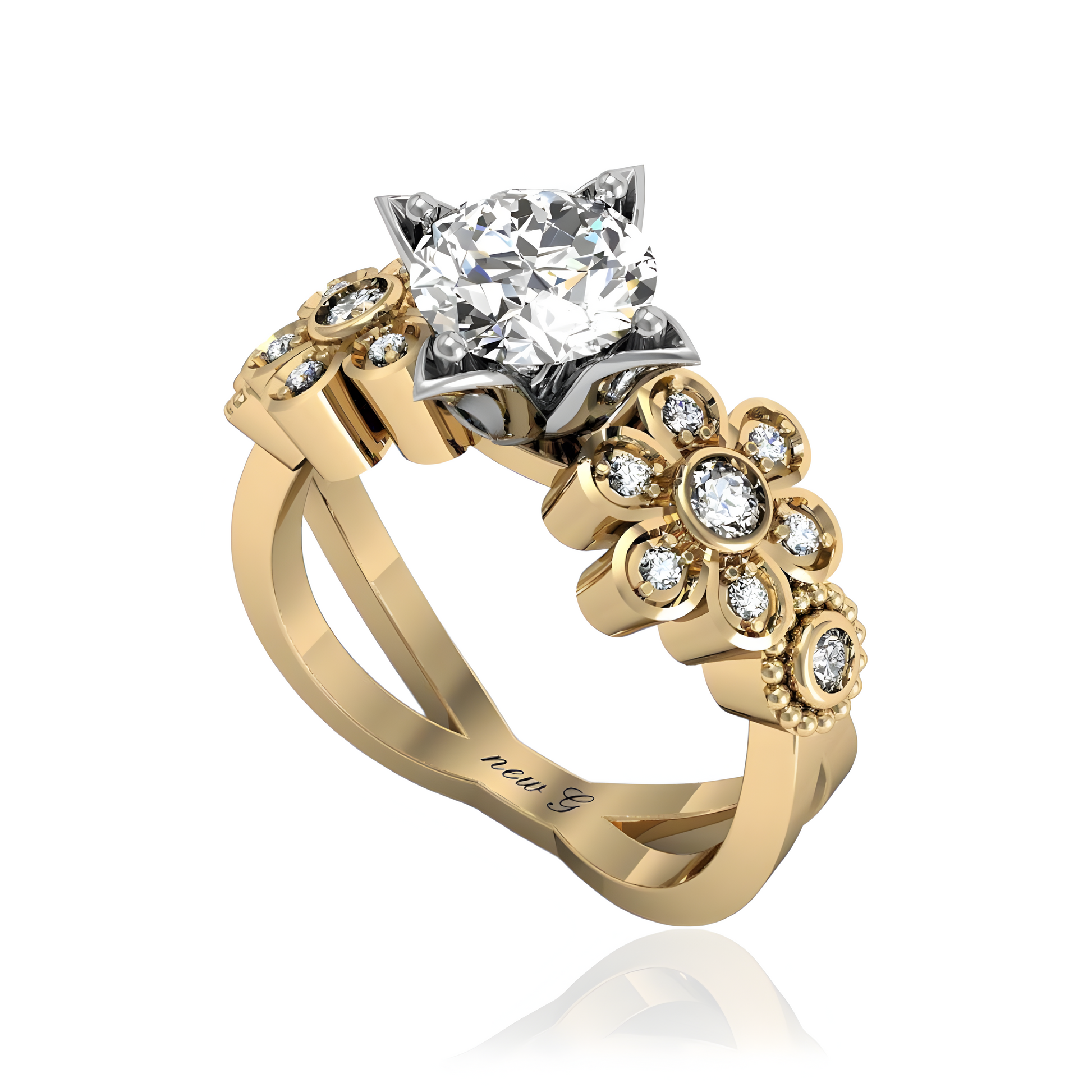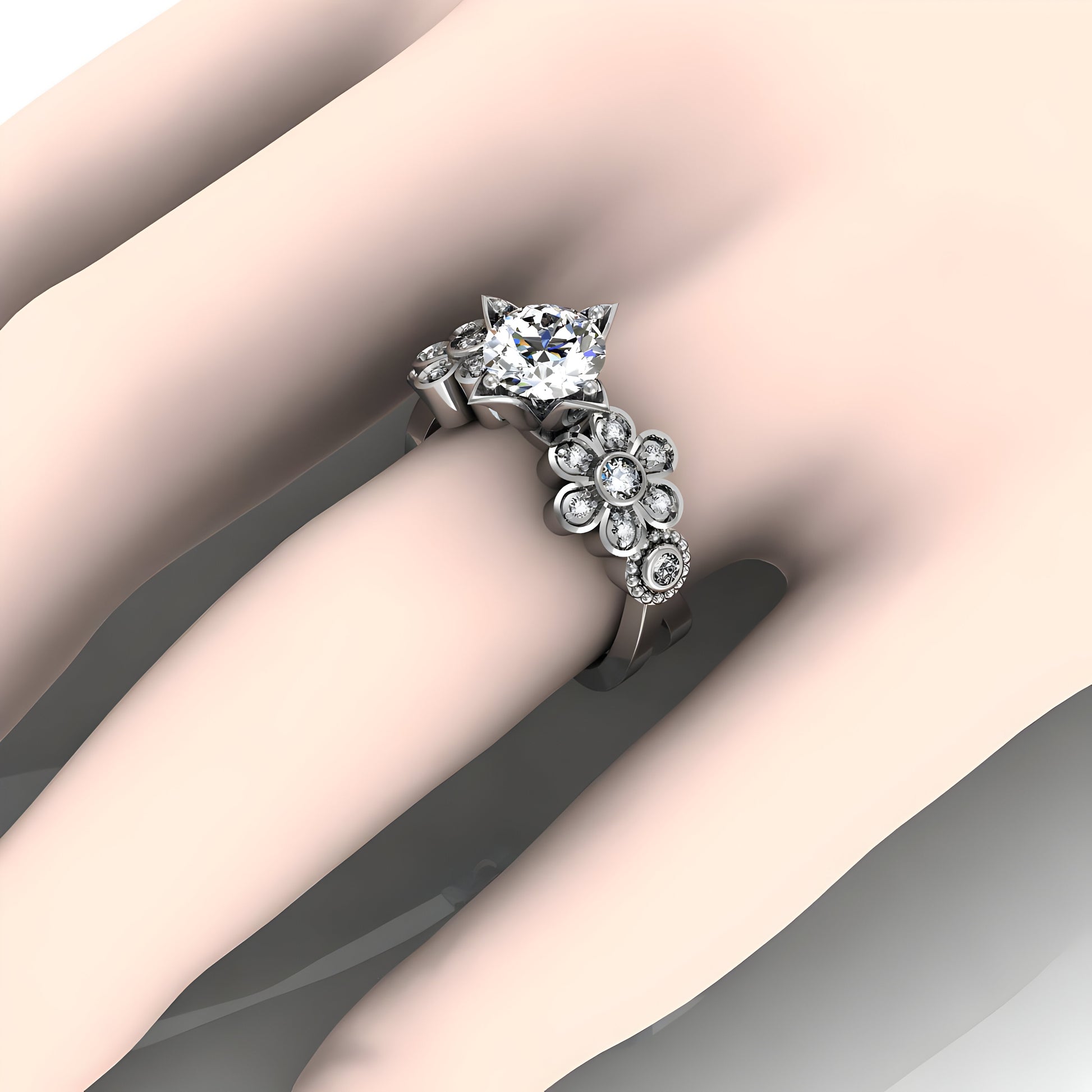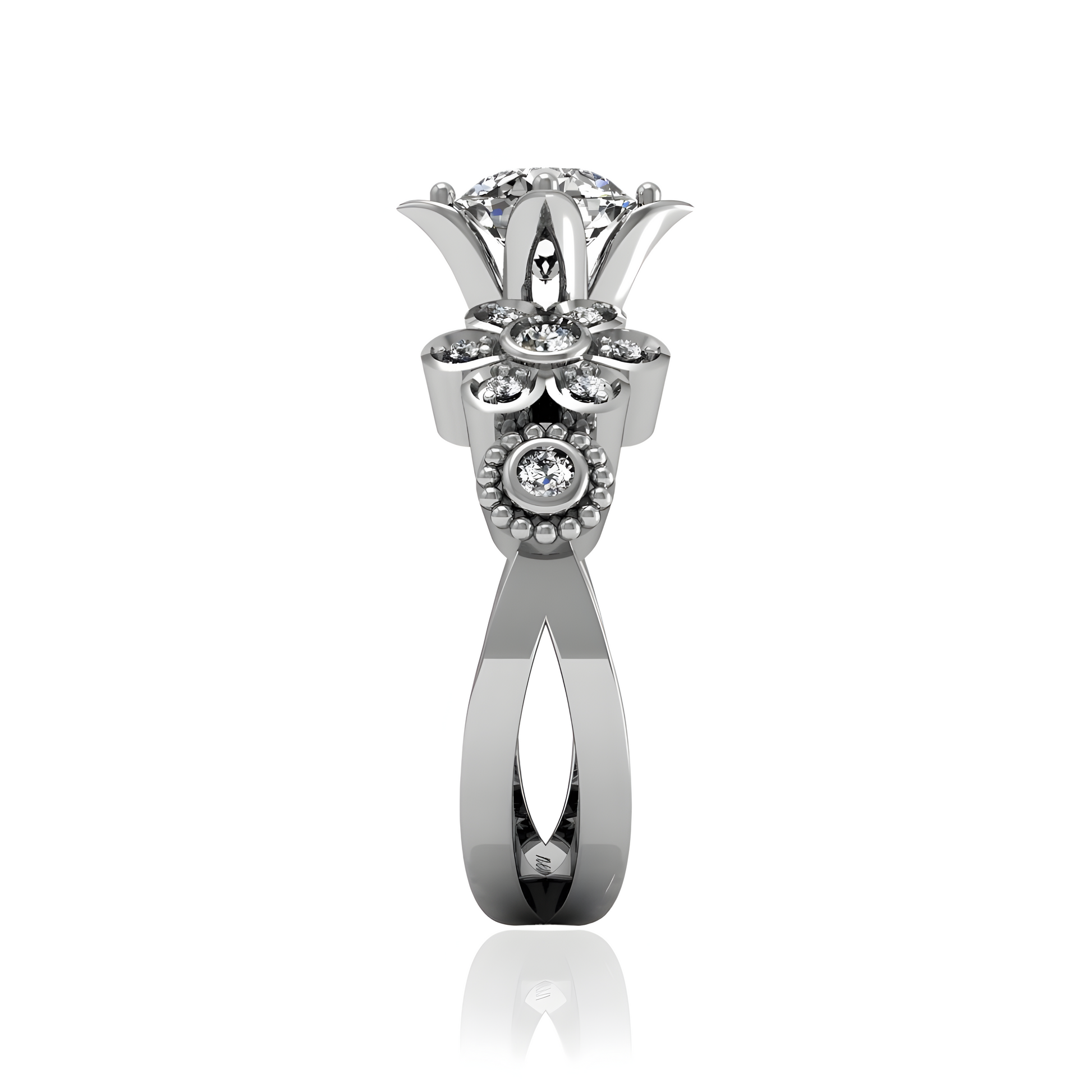 Illuminate your promise with this Sunflower Sparkle Diamond Engagement Ring, a symbol of joy and devotion. Expertly crafted in your choice of gold, rose gold, white gold, or platinum, this ring features a dazzling sunflower-inspired design. The central diamond, positioned prominently and available as a lab-grown diamond or a natural diamond, is surrounded by a halo of brilliant-cut diamonds that reflect the light beautifully. The elegantly sculpted petals, detailed with smaller diamonds, add a vibrant and romantic touch to this exquisite piece, making it perfect for a proposal filled with warmth and happiness.