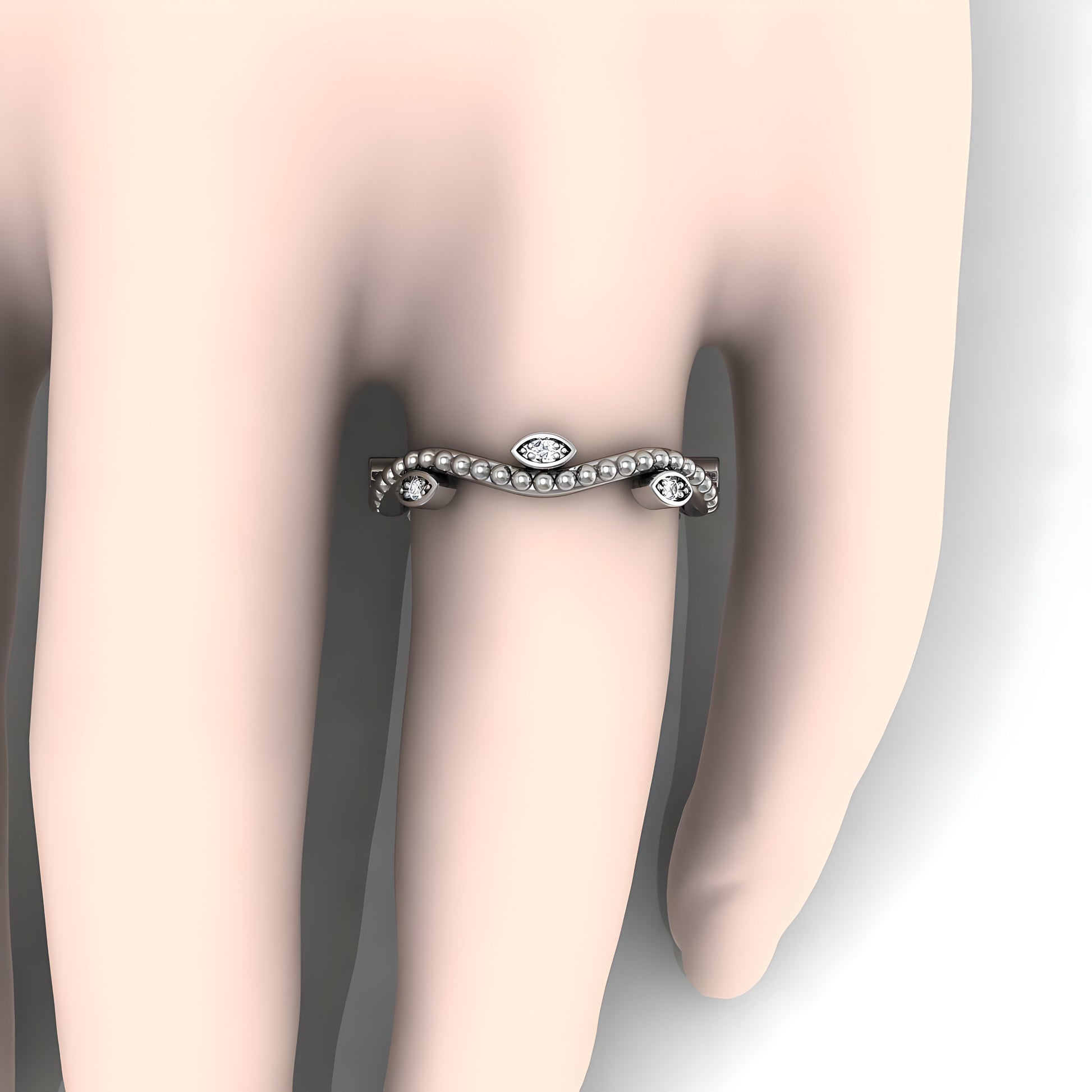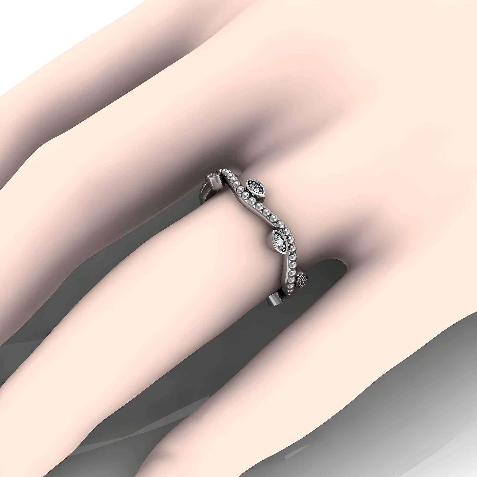 The Geometric Eternity Band presents a unique blend of modern design and classic elegance, featuring 20 dazzling diamonds, each encased in alternating round and square settings. The intricate milgrain detailing adds a touch of sophistication to this contemporary piece. Available in gold, rose gold, white gold, and platinum, this band is perfect for those who appreciate a bold yet refined style. The geometric pattern not only captures light beautifully but also adds a distinct architectural appeal to the design, making it a standout choice for an eternity band.
