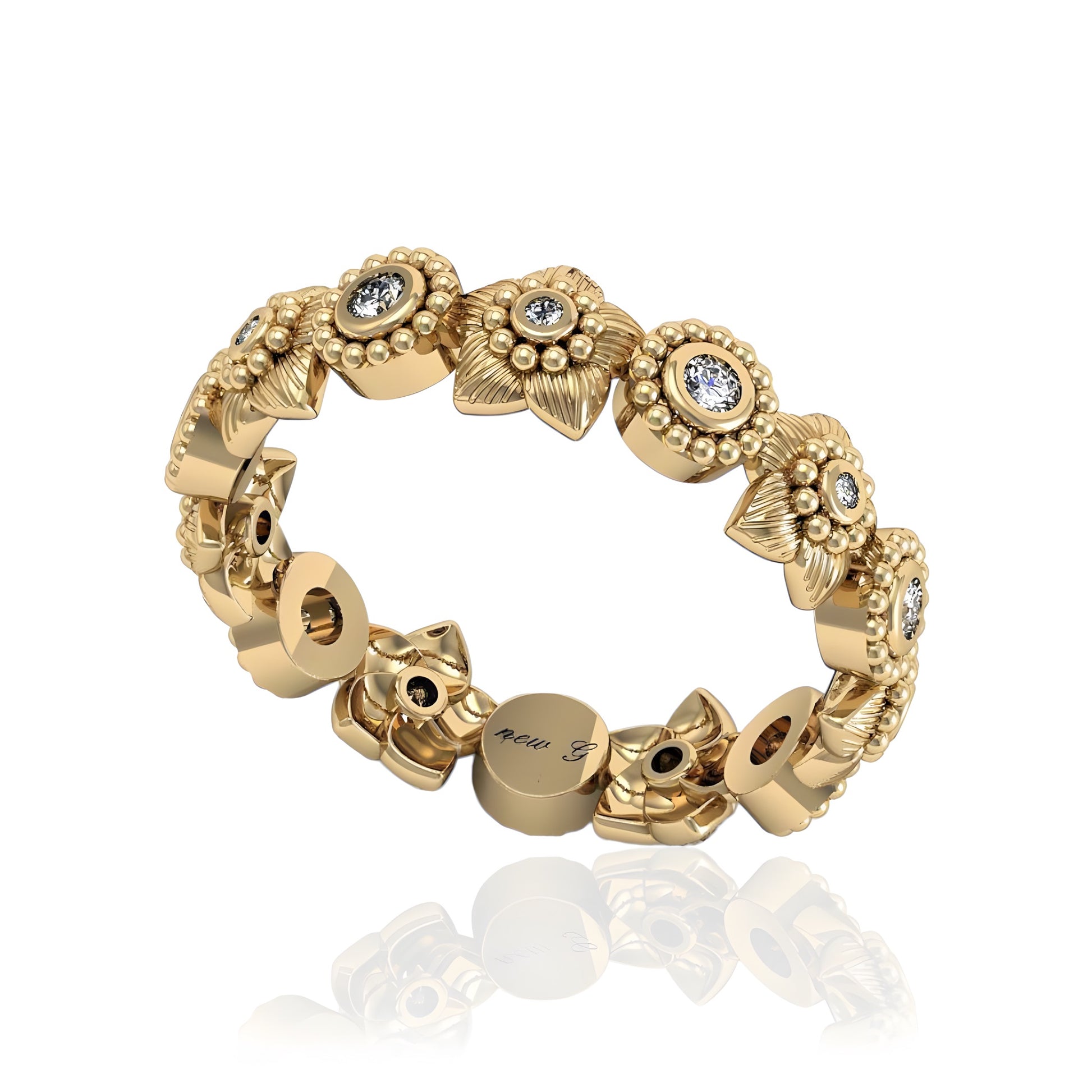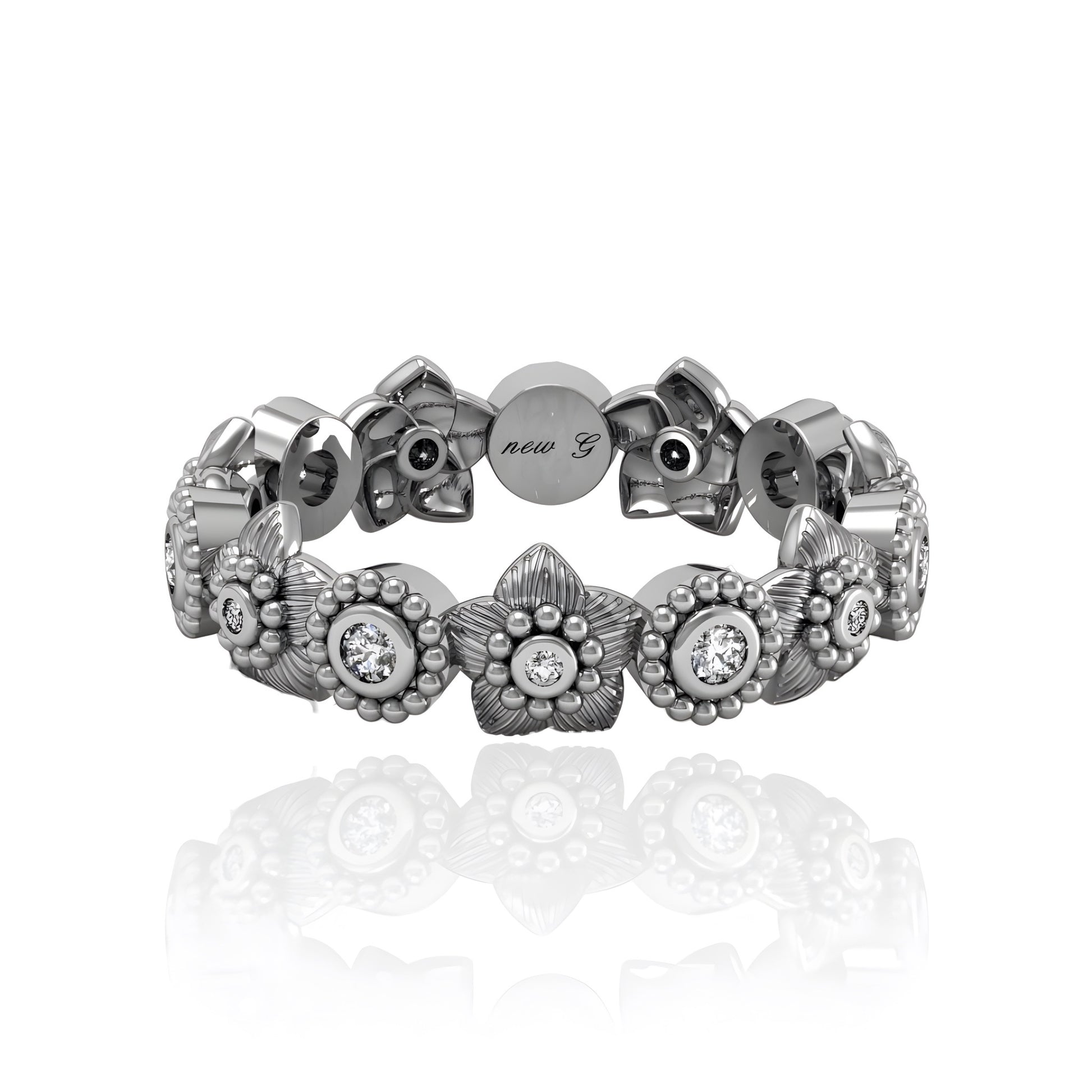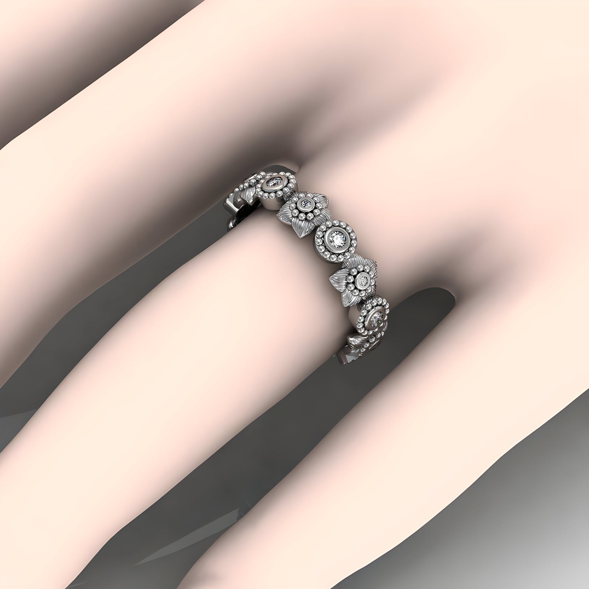This stunning floral-inspired diamond ring features intricate flower motifs, each adorned with a brilliant diamond in the center, offering an elegant touch of nature’s beauty. The band is thoughtfully crafted with detailed floral engravings, creating a timeless and feminine aesthetic. Available in gold, rose gold, white gold, or platinum, this ring can be tailored to your preference, making it a versatile and striking piece for any occasion.