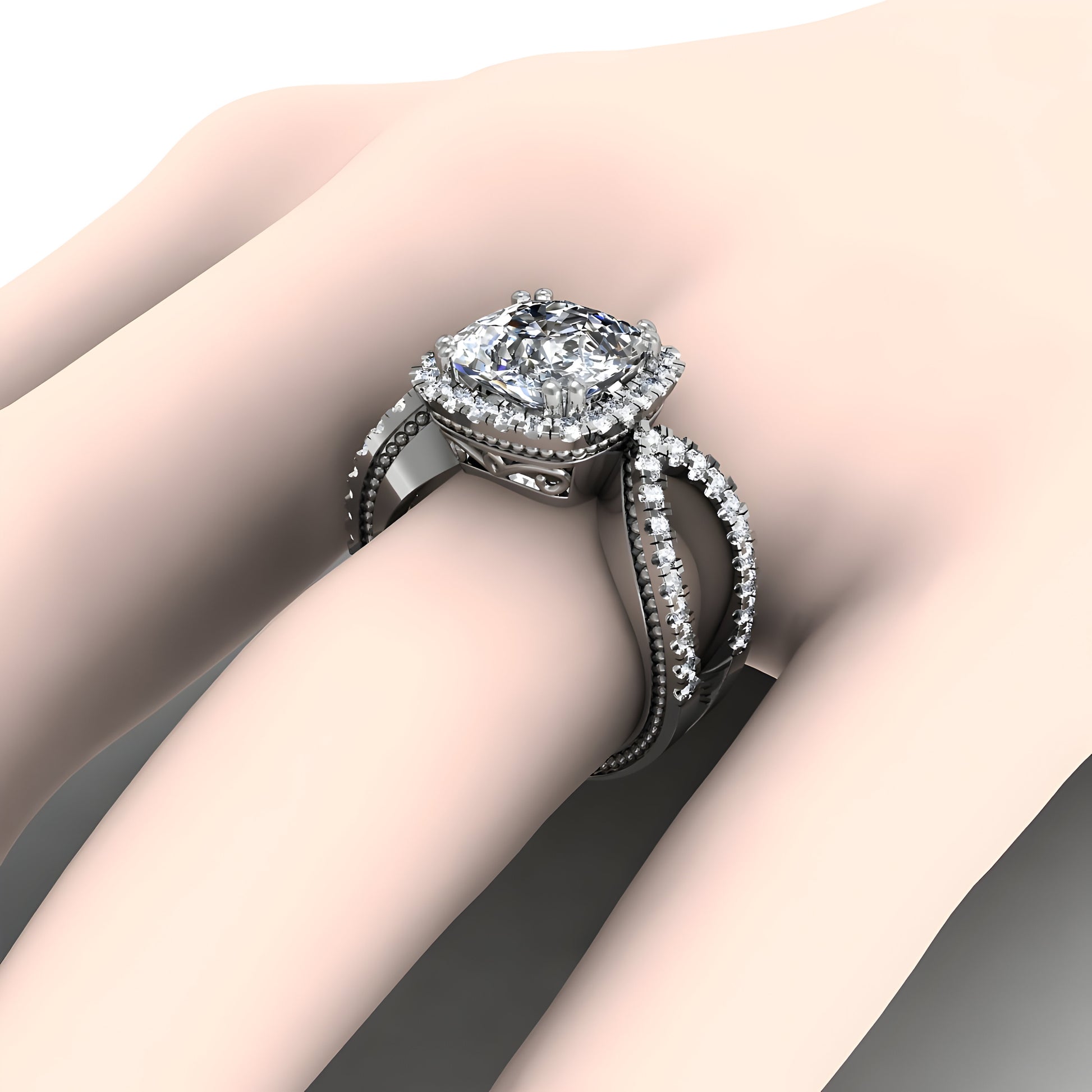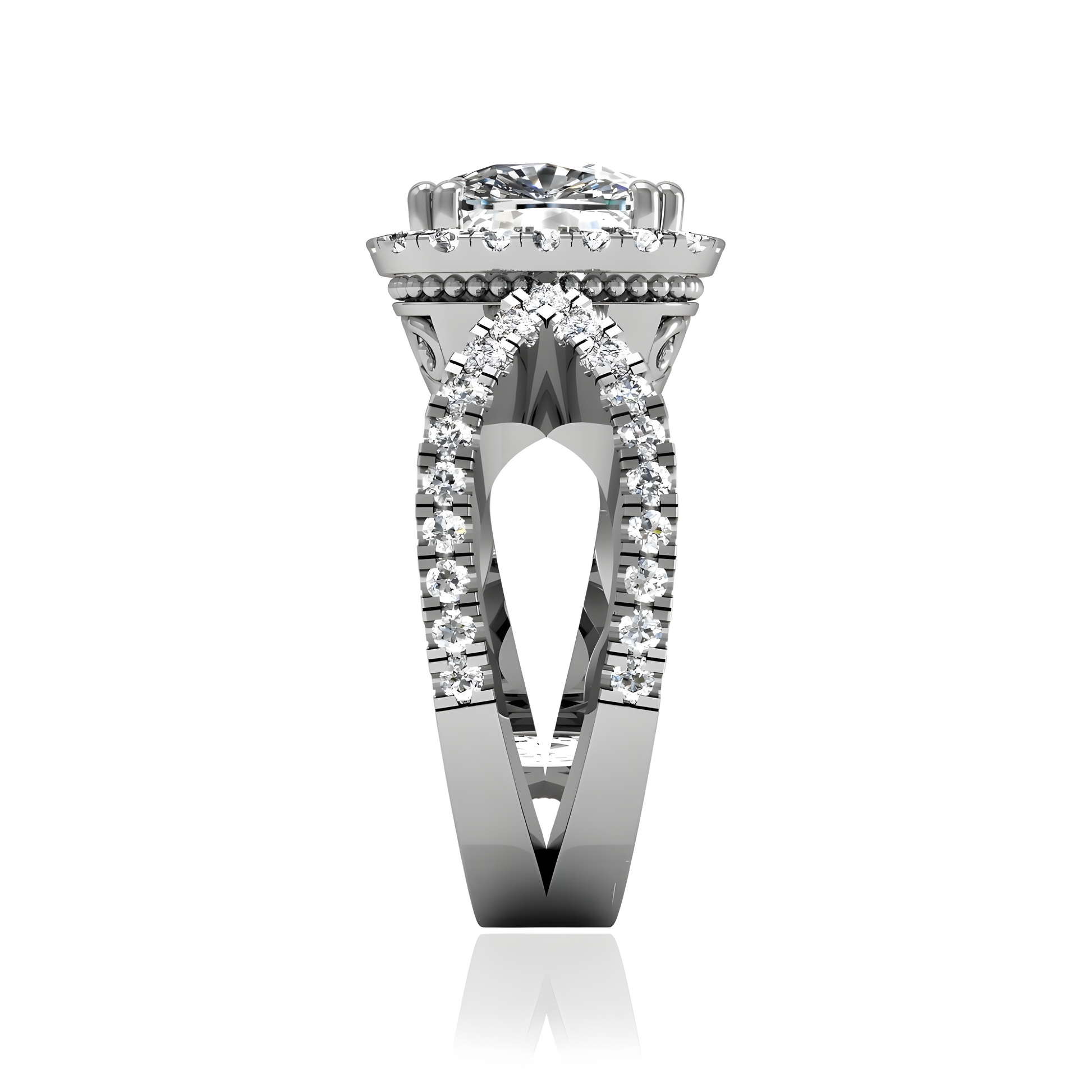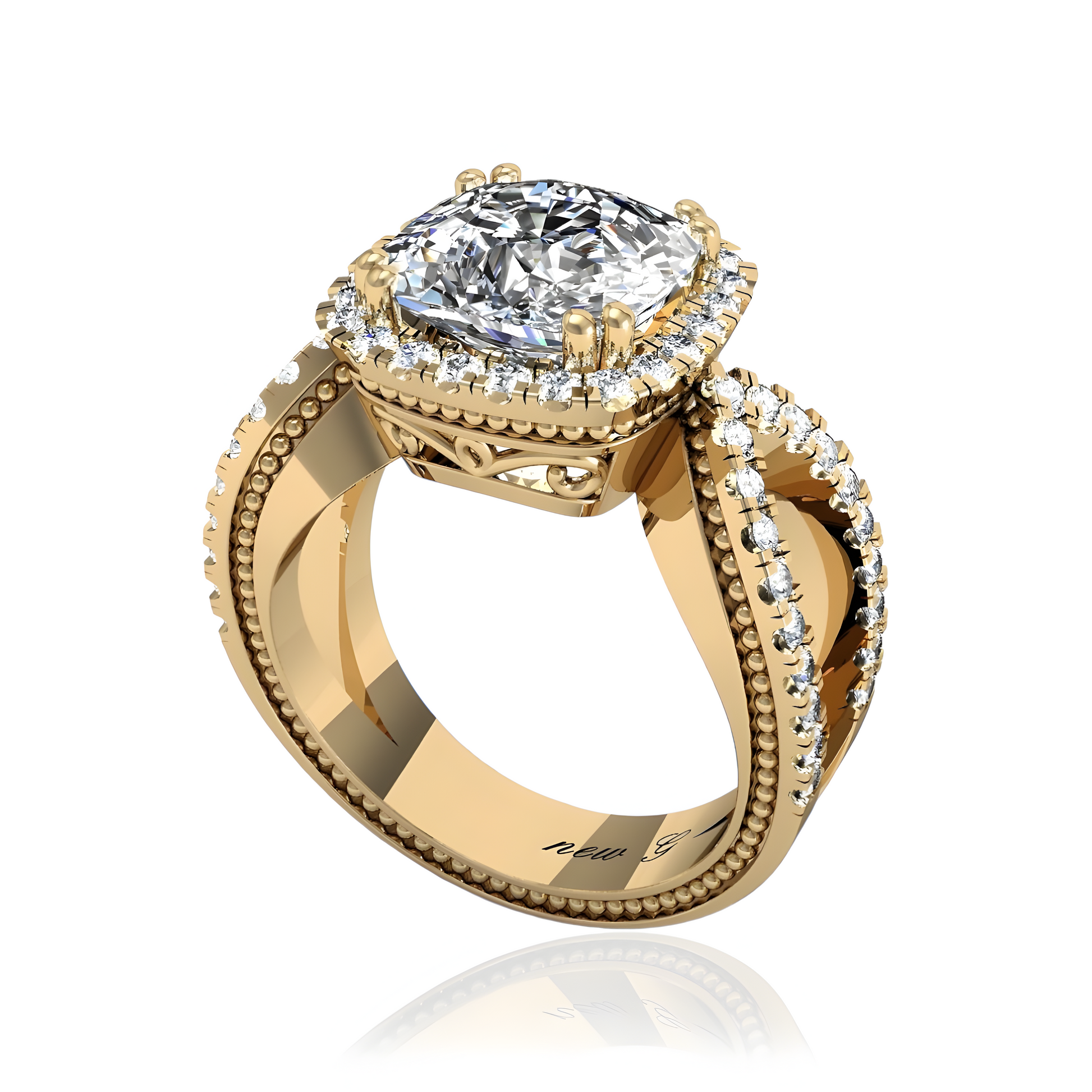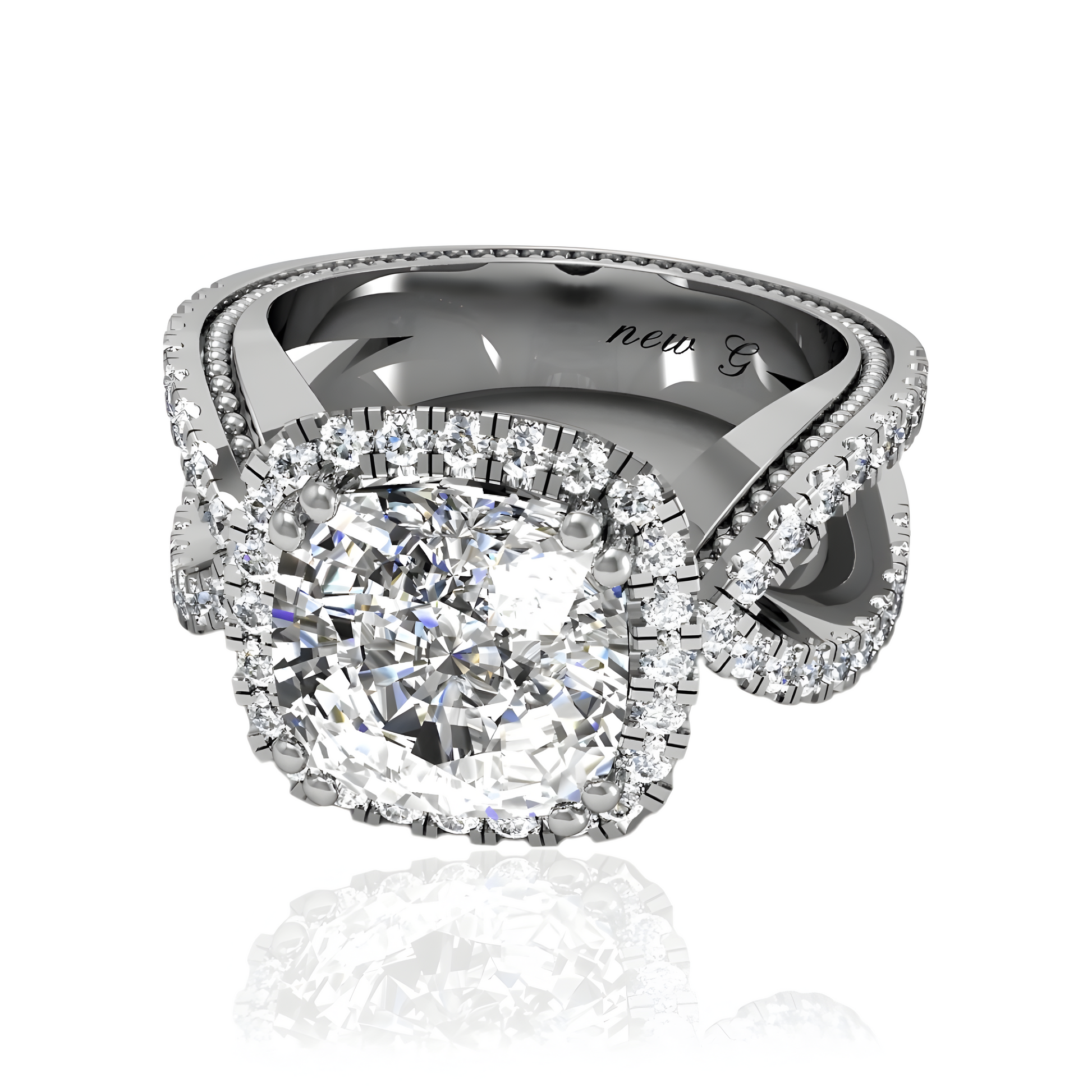 Make a statement with the Majestic Twist Halo Diamond Engagement Ring, a design that combines bold elegance with intricate craftsmanship. Available in gold, rose gold, white gold, or platinum, this ring features a stunning cushion-cut central diamond encircled by a halo of sparkling diamonds, enhancing its brilliance and size. The band showcases a unique twisted design, also encrusted with diamonds, that symbolizes the intertwining paths of your love story. The central diamond, available as a lab-grown diamond for those who favor sustainability or a natural diamond for classic luxury, is held securely in a four-prong setting, ensuring it catches the light beautifully from every angle. This ring is a perfect choice for those who seek a distinctive and luxurious symbol of their commitment.