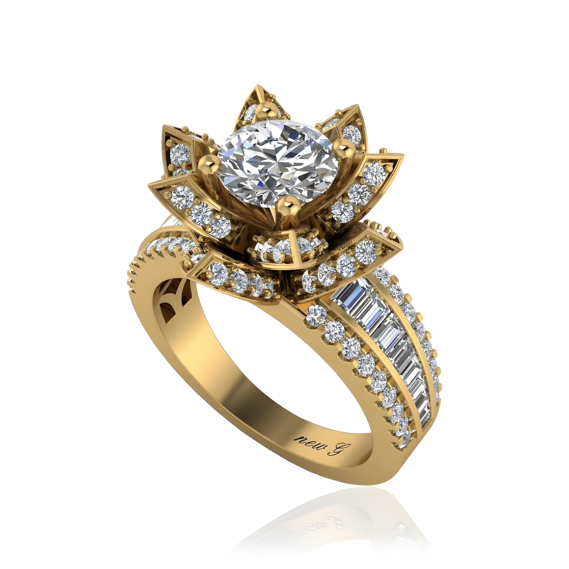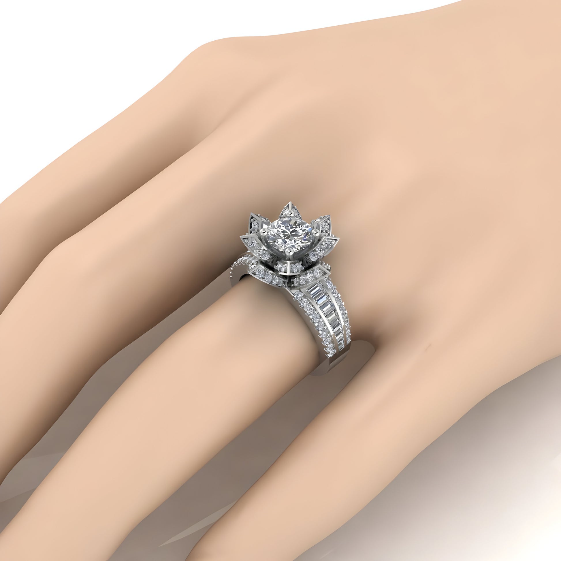 Immerse yourself in the serene beauty of nature with the Lotus Majesty Diamond Engagement Ring, a design that exudes elegance and tranquility. Available in gold, rose gold, white gold, or platinum, this ring showcases a breathtaking lotus flower setting, where each petal is meticulously adorned with brilliant diamonds. The central diamond, offered as a lab-grown diamond for those who cherish sustainability or a natural diamond for its timeless appeal, is cradled at the heart of the lotus, symbolizing purity and enlightenment. The band is further embellished with a combination of round and baguette-cut diamonds, creating a dazzling display of light and luxury that wraps around your finger. This ring is a perfect choice for those who seek a harmonious blend of nature-inspired beauty and exquisite craftsmanship.