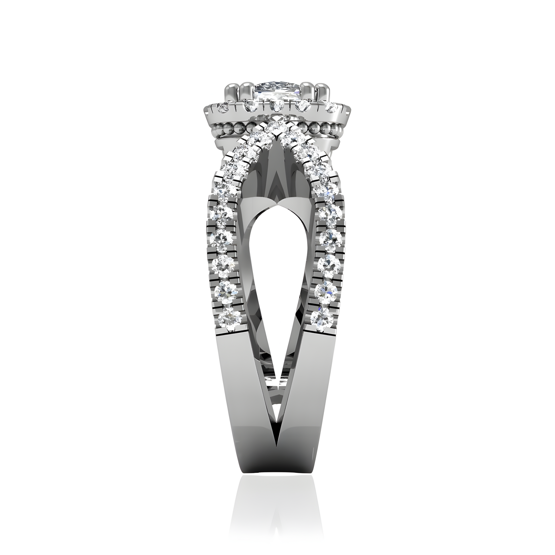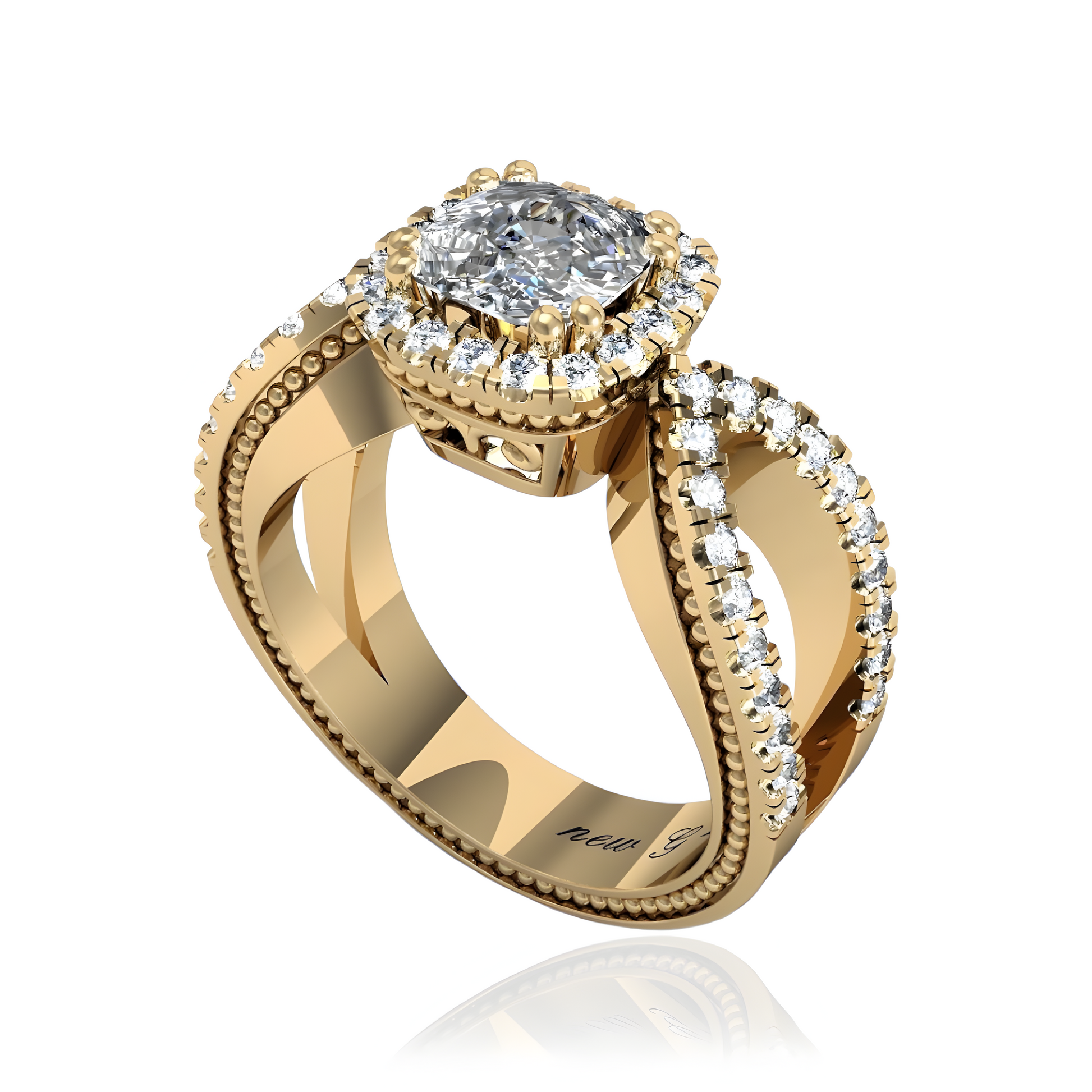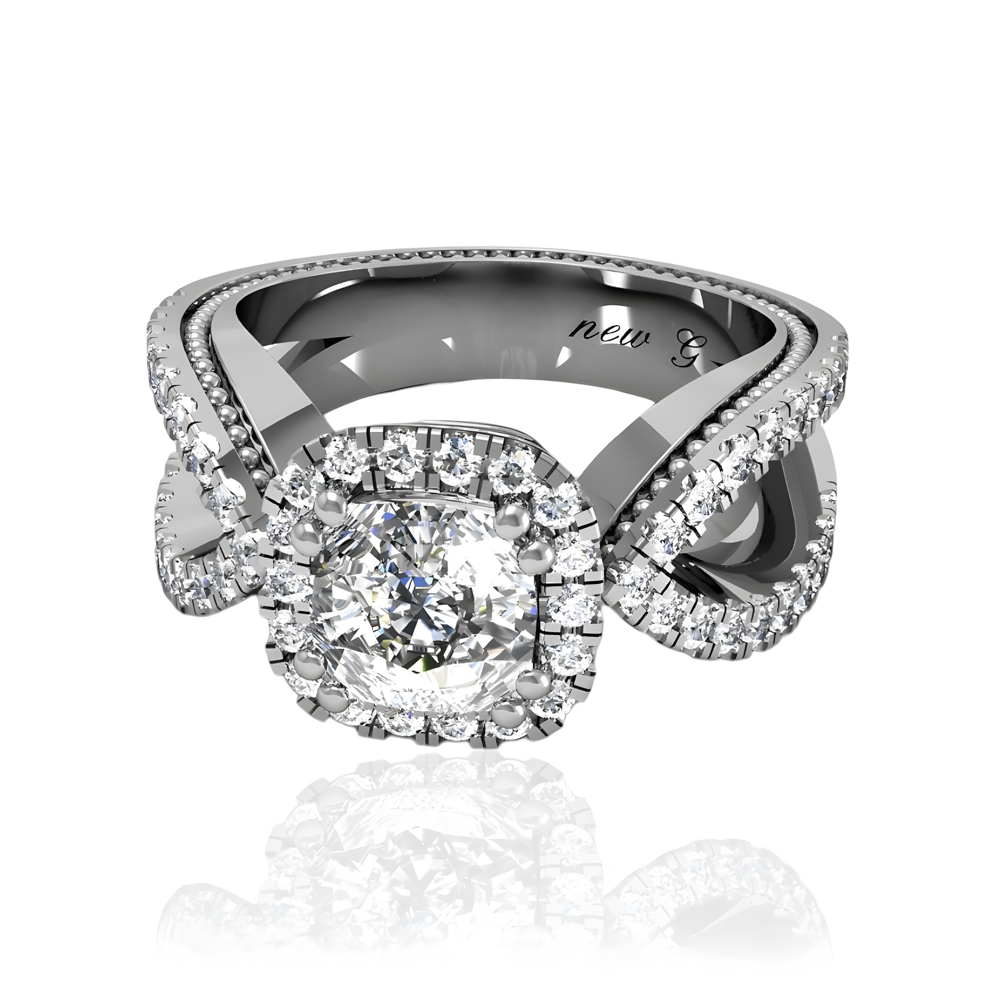 Radiate elegance with the Radiant Twist Halo Diamond Engagement Ring, a masterpiece that combines timeless beauty with a contemporary twist. Available in gold, rose gold, white gold, or platinum, this ring features a captivating cushion-cut diamond at its center, surrounded by a halo of smaller diamonds that amplify its brilliance. The band showcases a unique twist design, encrusted with additional diamonds, creating a stunning interplay of light and sparkle. The central diamond, which can be selected as a lab-grown diamond for modern sophistication or a natural diamond for enduring allure, is held securely in a four-prong setting. The milgrain detailing along the edges adds a touch of vintage charm, making this ring a perfect symbol of your eternal love.