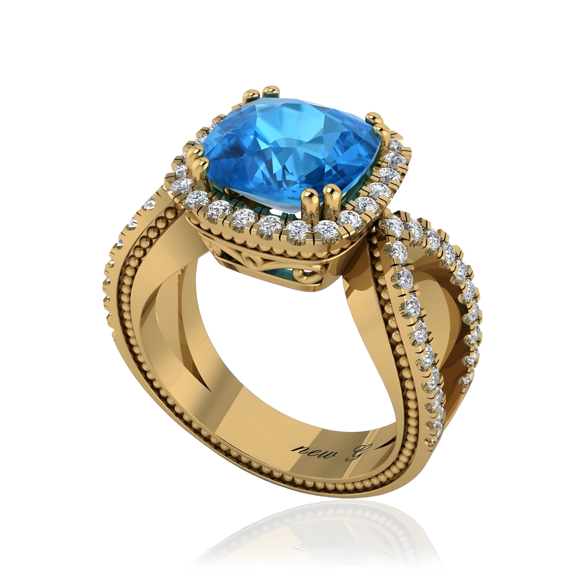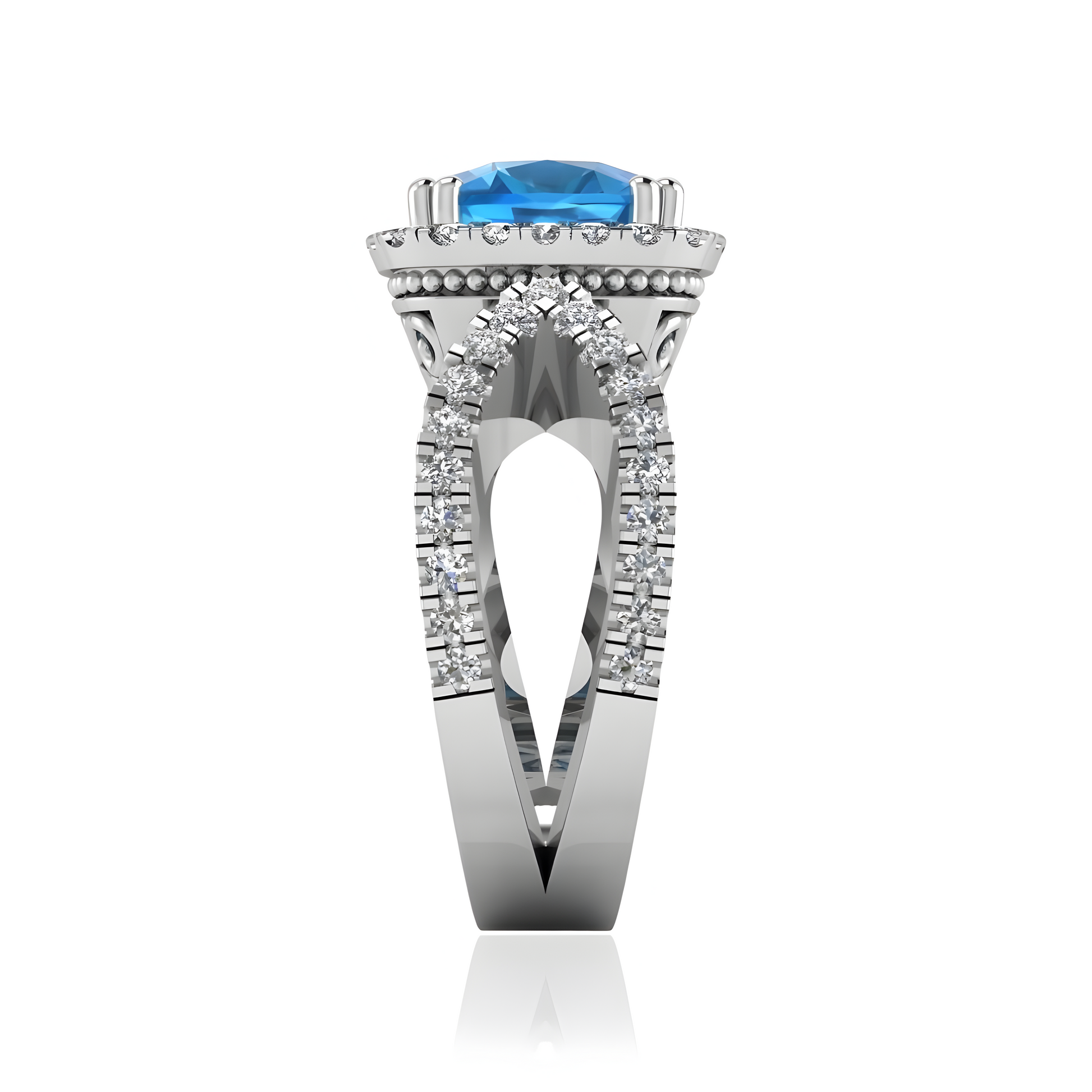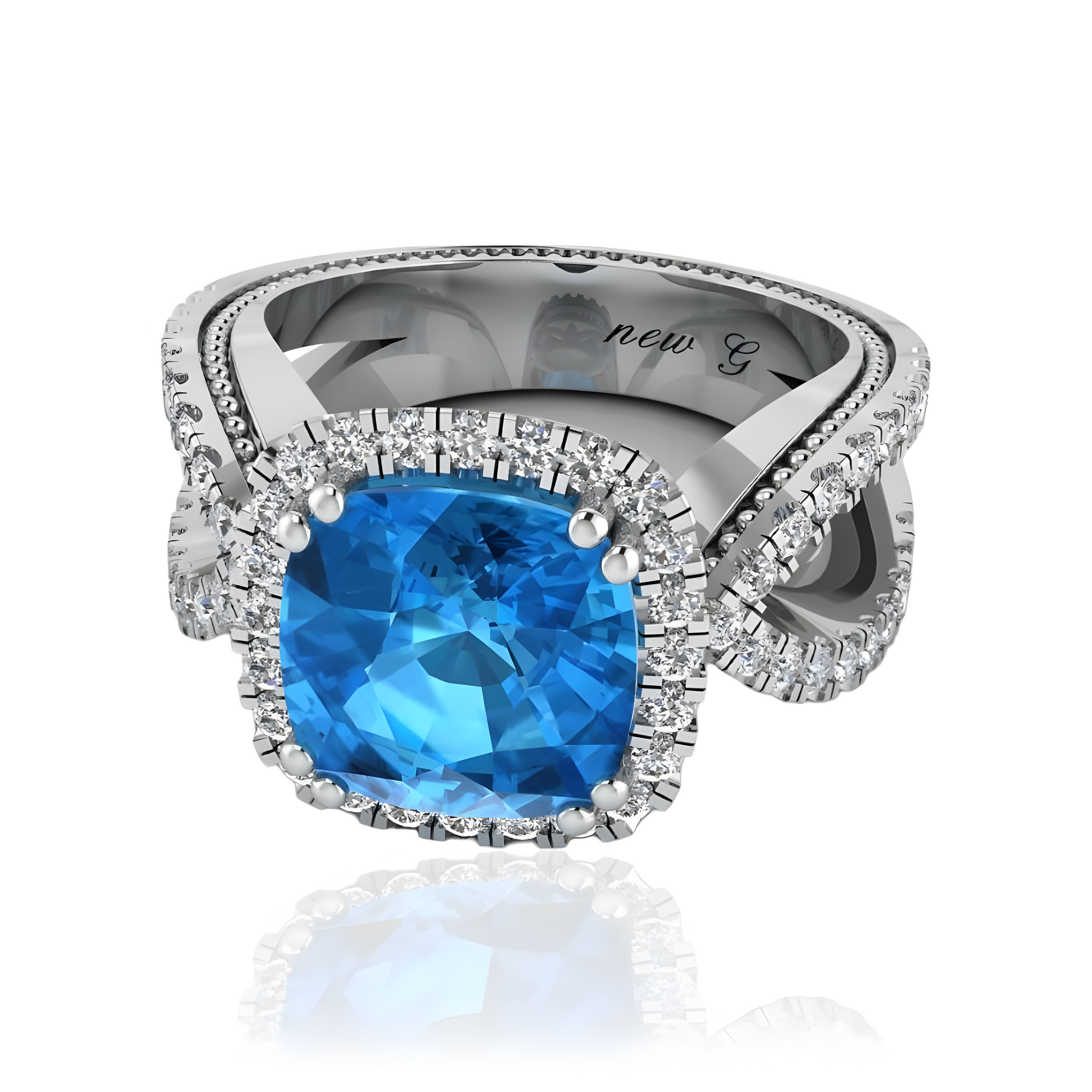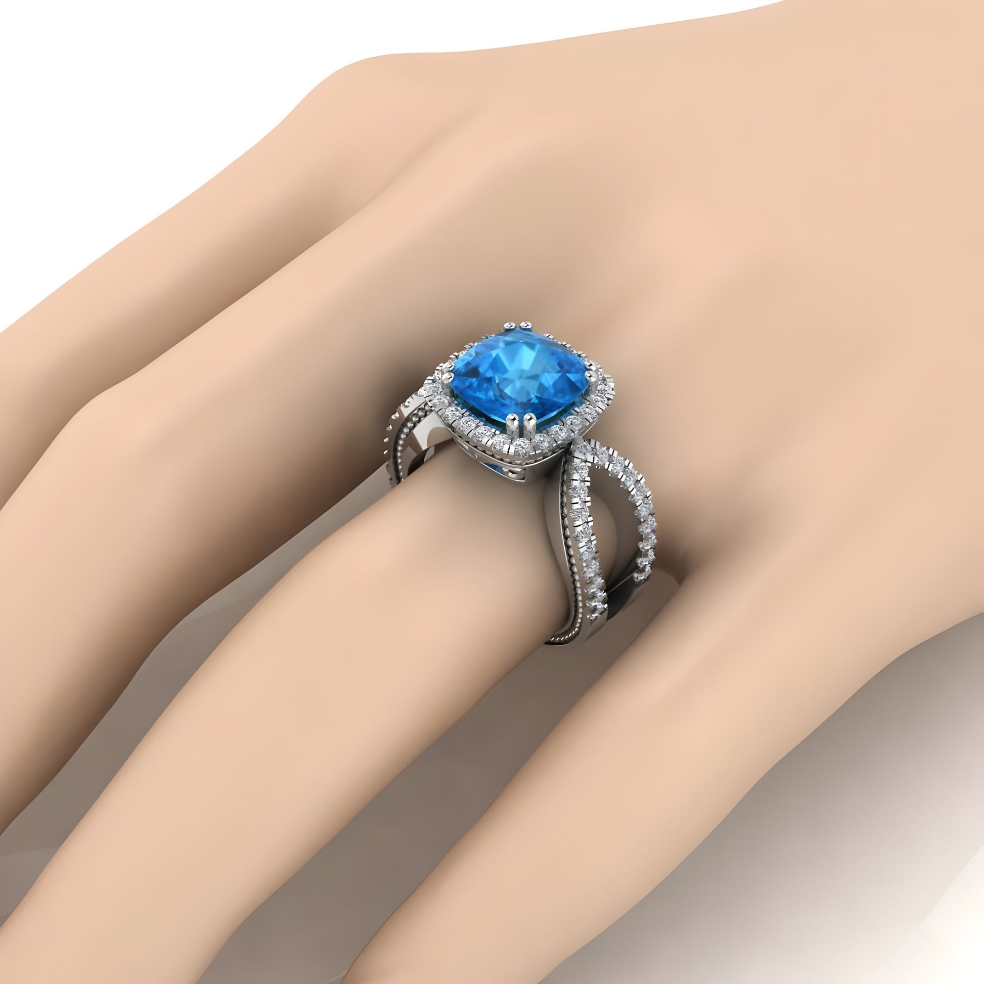Dive into the serene beauty of the Oceanic Dream Aquamarine Engagement Ring, a stunning piece that captures the tranquil essence of the sea. This ring, available in gold, rose gold, white gold, or platinum, showcases a mesmerizing cushion-cut aquamarine gemstone at its center, radiating a captivating blue hue reminiscent of the ocean's depths. Surrounding the aquamarine is a halo of sparkling diamonds, enhancing the gemstone's natural brilliance. The band features a unique twist design, also encrusted with diamonds, symbolizing the intertwining paths of your love story. With intricate milgrain detailing along the edges, this ring is a perfect blend of modern sophistication and timeless elegance, ideal for those who seek a unique and refreshing symbol of their love.