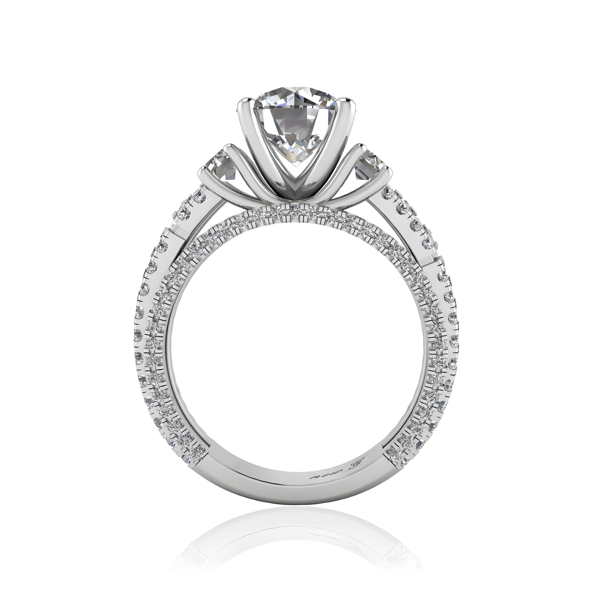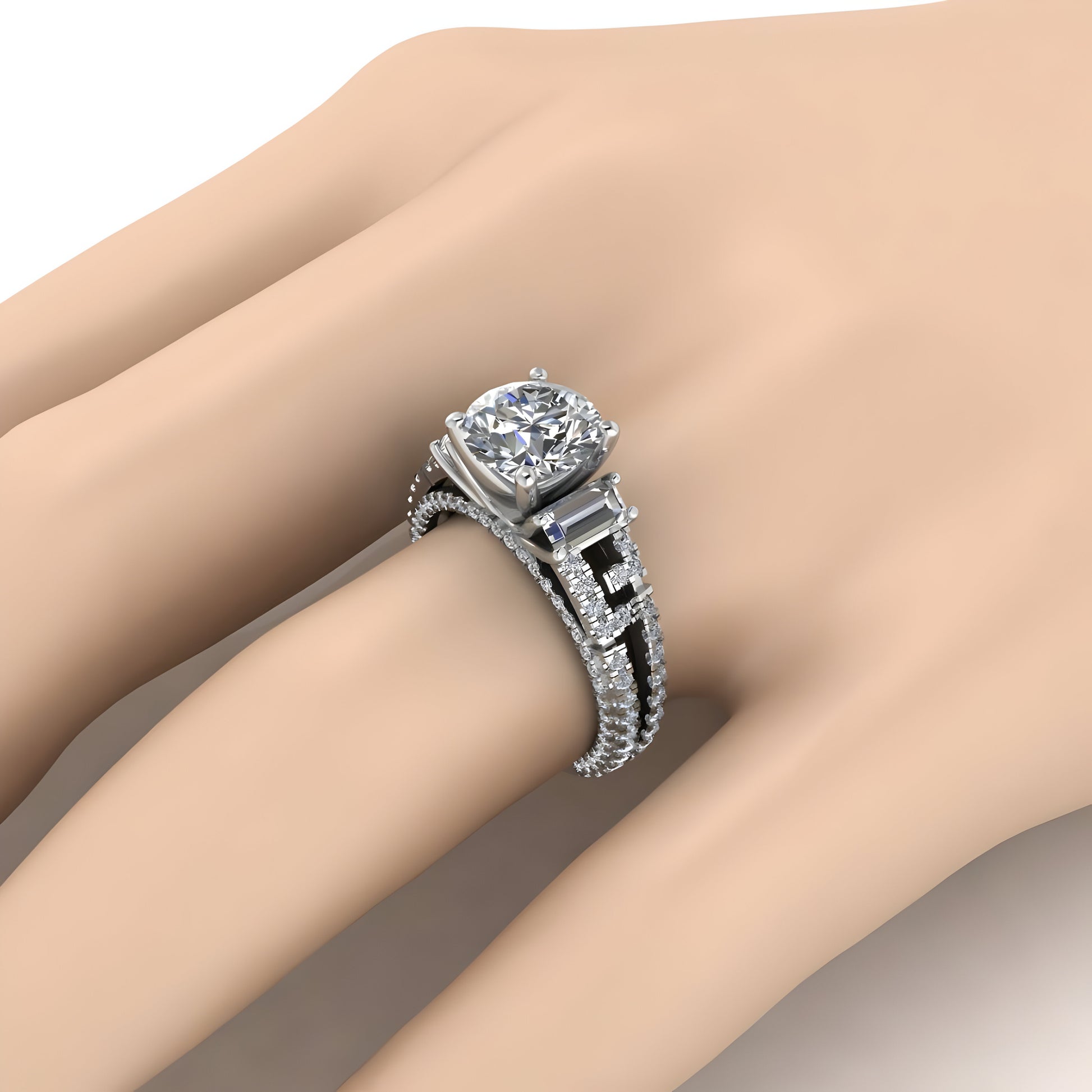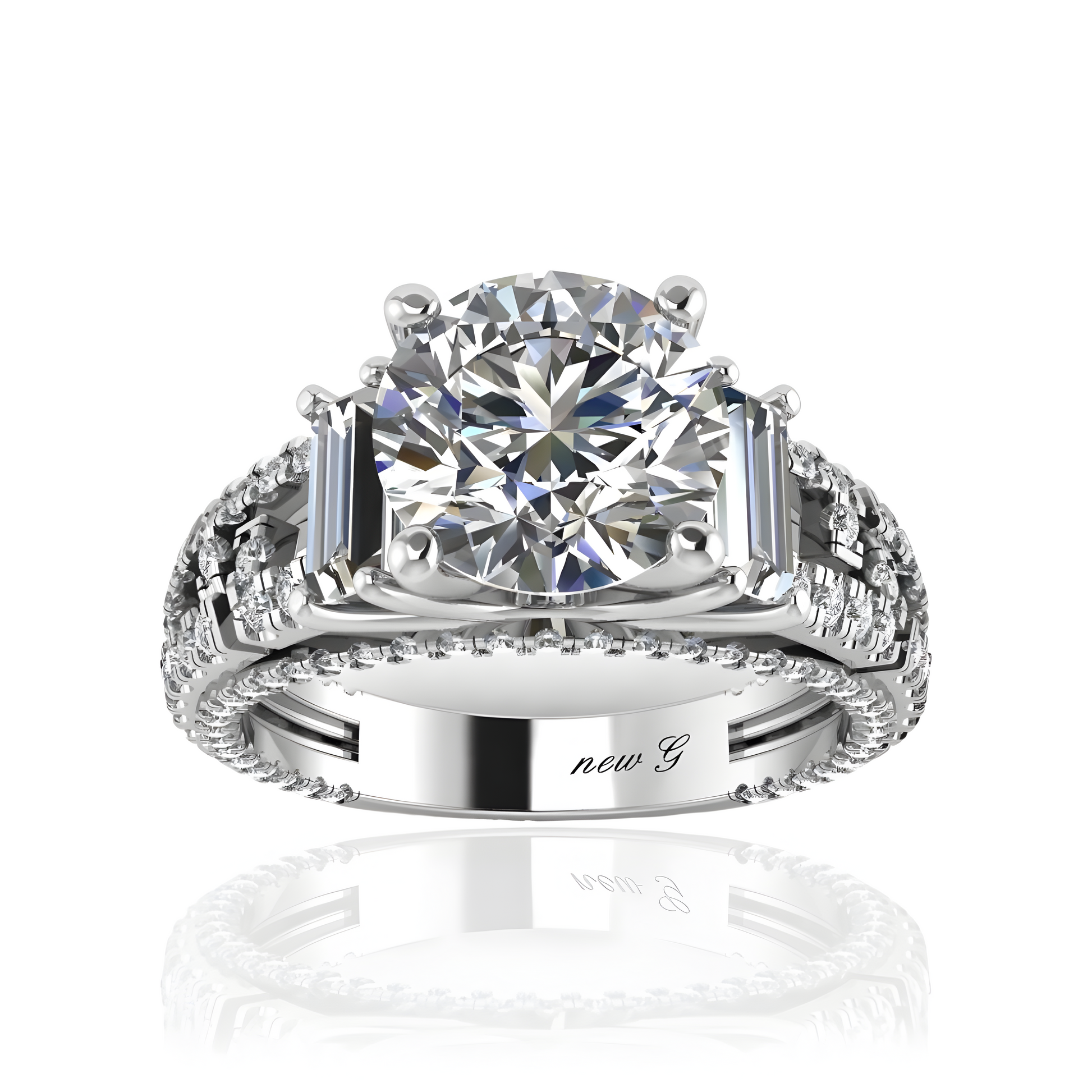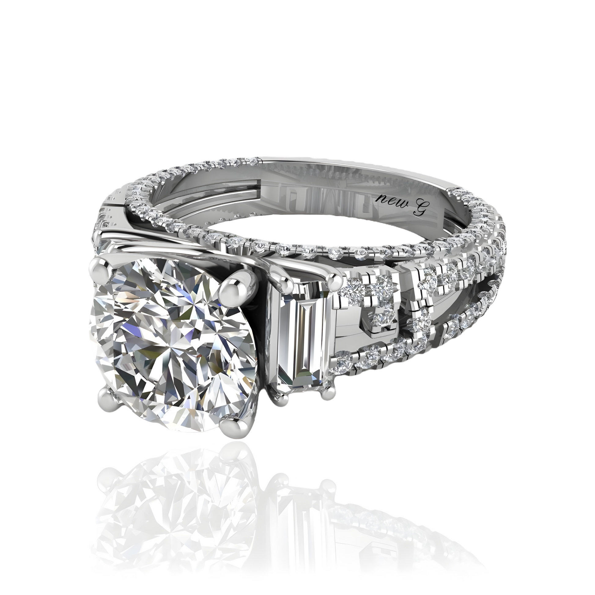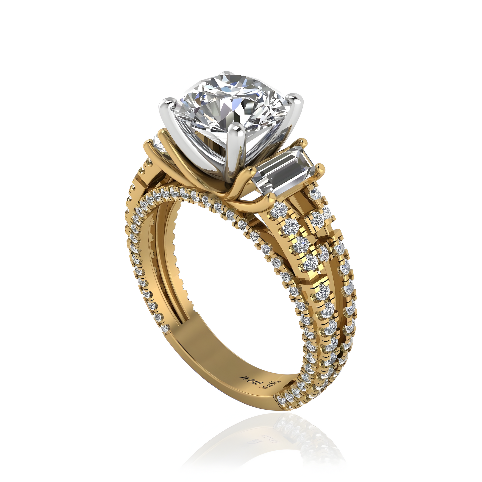 Experience the epitome of elegance with the Regal Tranquility Diamond Engagement Ring, a piece that exudes sophistication and timeless beauty. Available in gold, rose gold, white gold, or platinum, this ring features a stunning cushion-cut central diamond, flanked by two elegant baguette-cut diamonds that add a touch of modern refinement. The central diamond, which can be chosen as a lab-grown diamond for contemporary luxury or a natural diamond for classic allure, is set in a four-prong setting that allows maximum light reflection. The band is adorned with a dazzling array of round-cut diamonds, creating a continuous sparkle that wraps around the finger. This ring is perfect for those who seek a regal yet serene expression of their love.