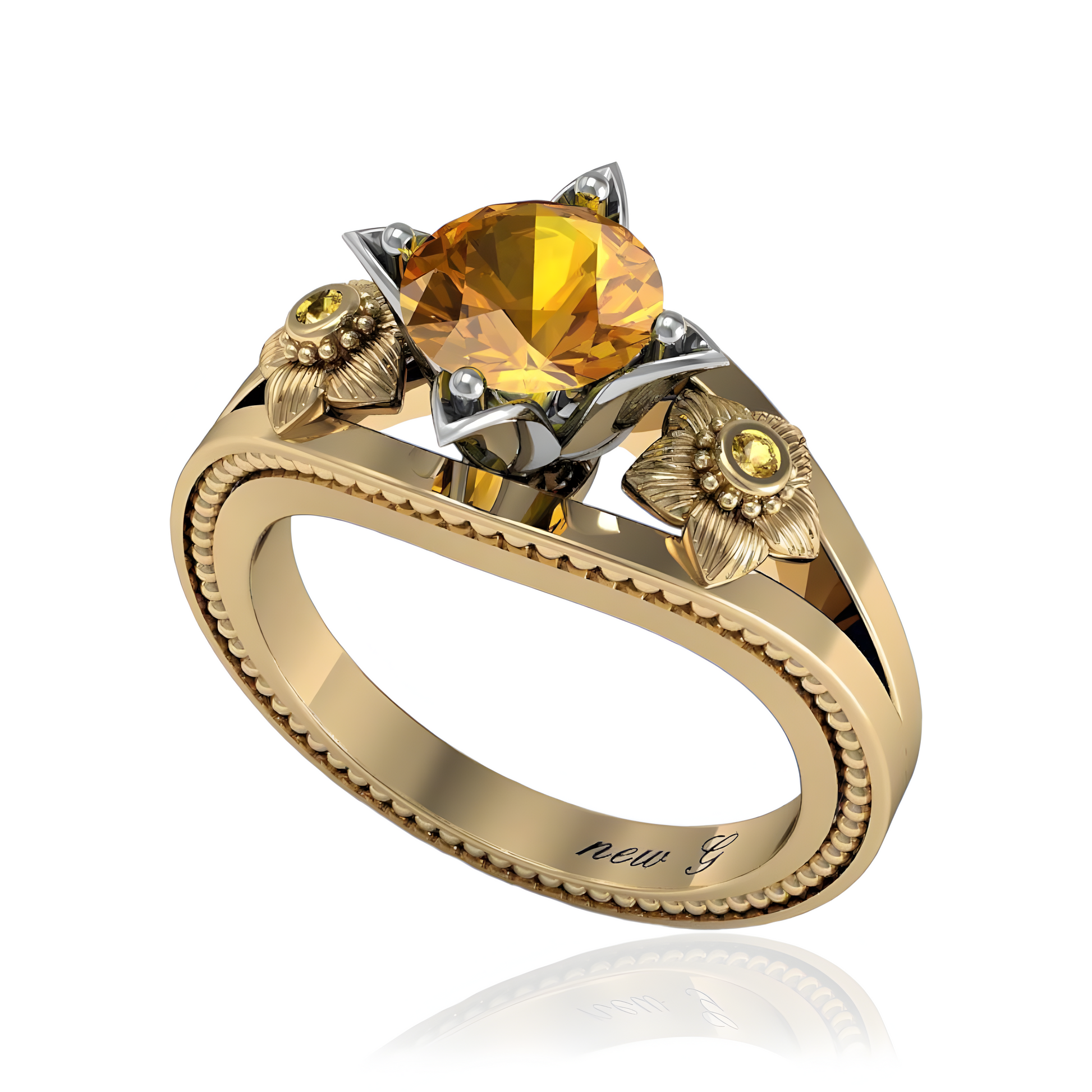 Embrace the warmth and brilliance of the Golden Glow Topaz Engagement Ring, a design that radiates joy and optimism. This stunning ring, available in gold, rose gold, white gold, or platinum, features a vibrant round-cut topaz at its center, symbolizing affection, love, and good fortune. The rich golden hue of the topaz is beautifully complemented by a floral-inspired setting, with intricate flower motifs on either side of the band, each accented with smaller matching topaz stones. The band is adorned with delicate milgrain detailing, adding a touch of vintage elegance to the overall design. Perfect for those who seek a joyful and uplifting symbol of their love, this ring is a celebration of the brightest moments in life.