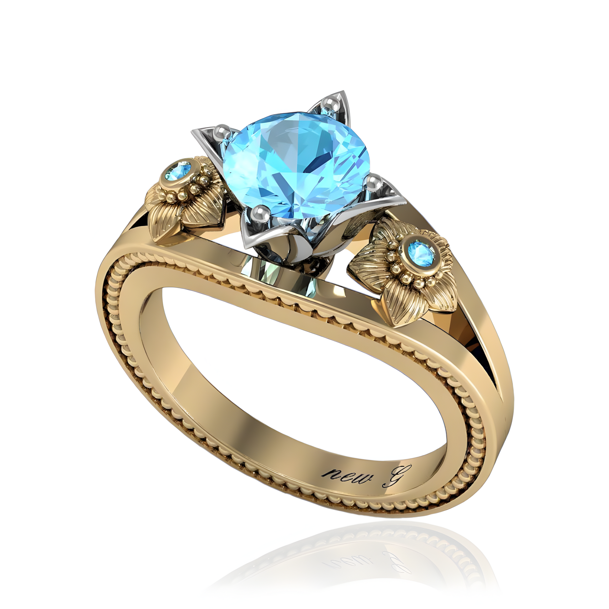 Immerse yourself in the serene beauty of the Tranquil Seas Aquamarine Engagement Ring, a design that reflects the calming and rejuvenating essence of the ocean. This exquisite ring, available in gold, rose gold, white gold, or platinum, features a stunning round-cut aquamarine gemstone at its center, symbolizing clarity, harmony, and peace. The cool blue hue of the aquamarine is beautifully complemented by a floral-inspired setting, with intricate flower motifs on either side of the band, each accented with smaller matching aquamarine stones. The band is adorned with delicate milgrain detailing, adding a touch of vintage charm to this refreshing design. Perfect for those who seek a unique and serene expression of their love, this ring is a true embodiment of tranquility and elegance.