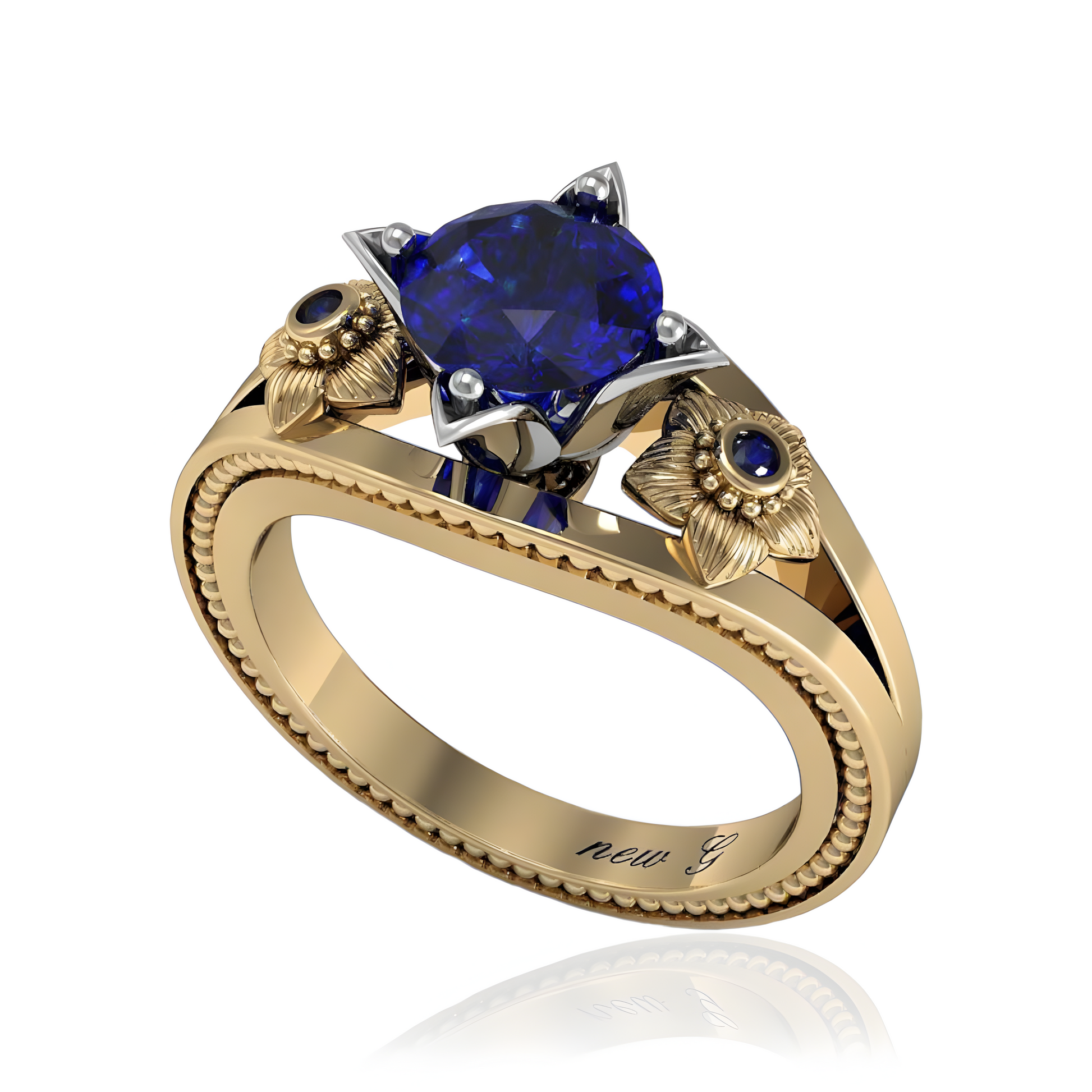 Unveil the mystery and elegance of the Midnight Garden Sapphire Engagement Ring, a design that captures the allure of a starlit night. This exquisite ring, available in gold, rose gold, white gold, or platinum, features a mesmerizing round-cut sapphire at its center, symbolizing wisdom, loyalty, and nobility. The deep blue hue of the sapphire is beautifully complemented by a floral-inspired setting, with intricate flower motifs on either side of the band, each accented with smaller matching sapphire stones. The band is adorned with delicate milgrain detailing, adding a touch of vintage charm to this captivating design. Perfect for those who seek a timeless and enchanting expression of their love, this ring is a true celebration of elegance and mystery.