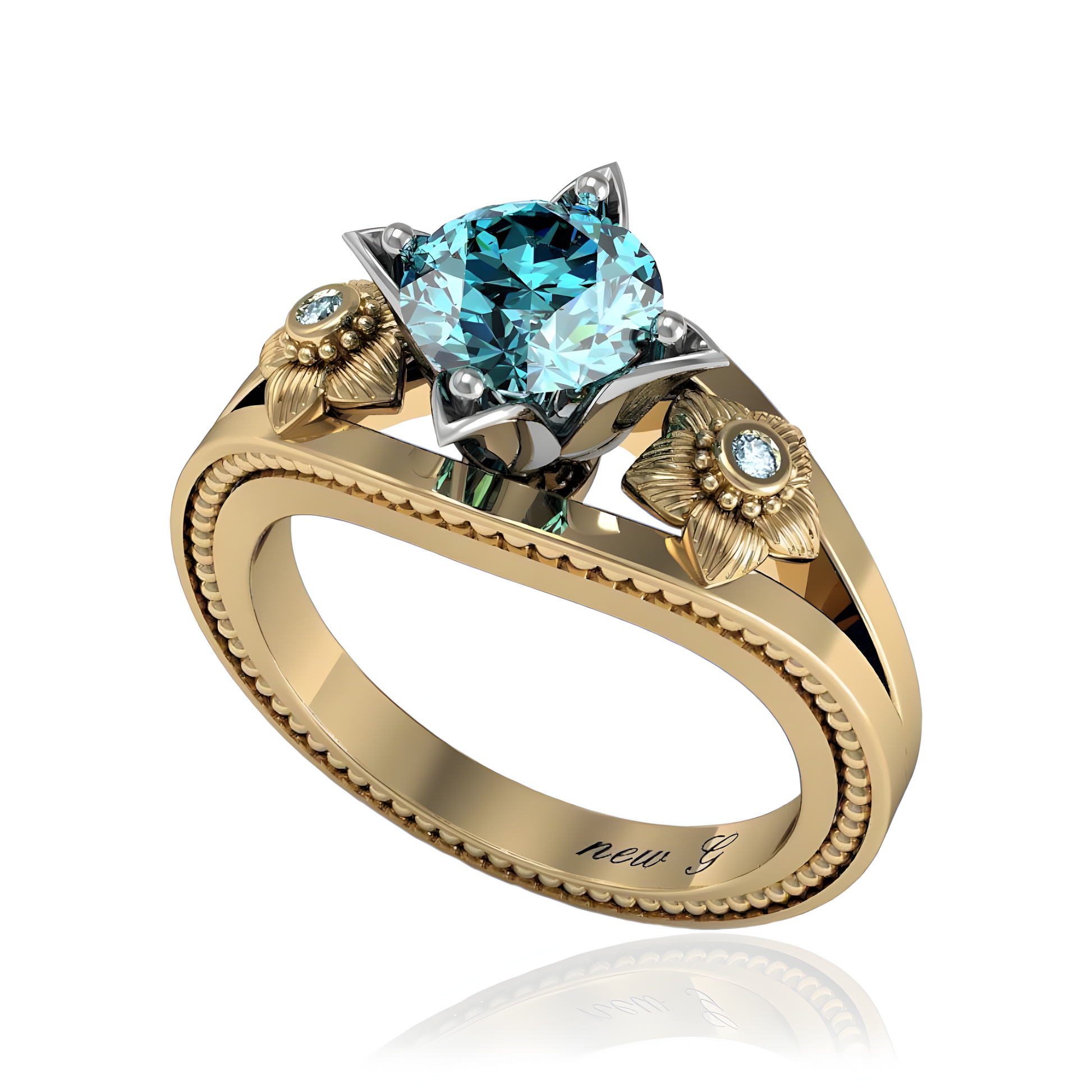 Elevate your love story with the Celestial Spark Zircon Engagement Ring, a design that captures the brilliance of the night sky. This stunning ring, available in gold, rose gold, white gold, or platinum, features a captivating round-cut zircon at its center, symbolizing clarity, wisdom, and protection. The zircon's vibrant blue hue reflects the beauty of a starry night, complemented by a floral-inspired setting with intricate flower motifs on either side of the band, each accented with smaller matching zircon stones. The band is further embellished with delicate milgrain detailing, adding a touch of vintage charm to this radiant design. Perfect for those who seek a luminous and elegant expression of their love, this ring is a true celebration of light and beauty.