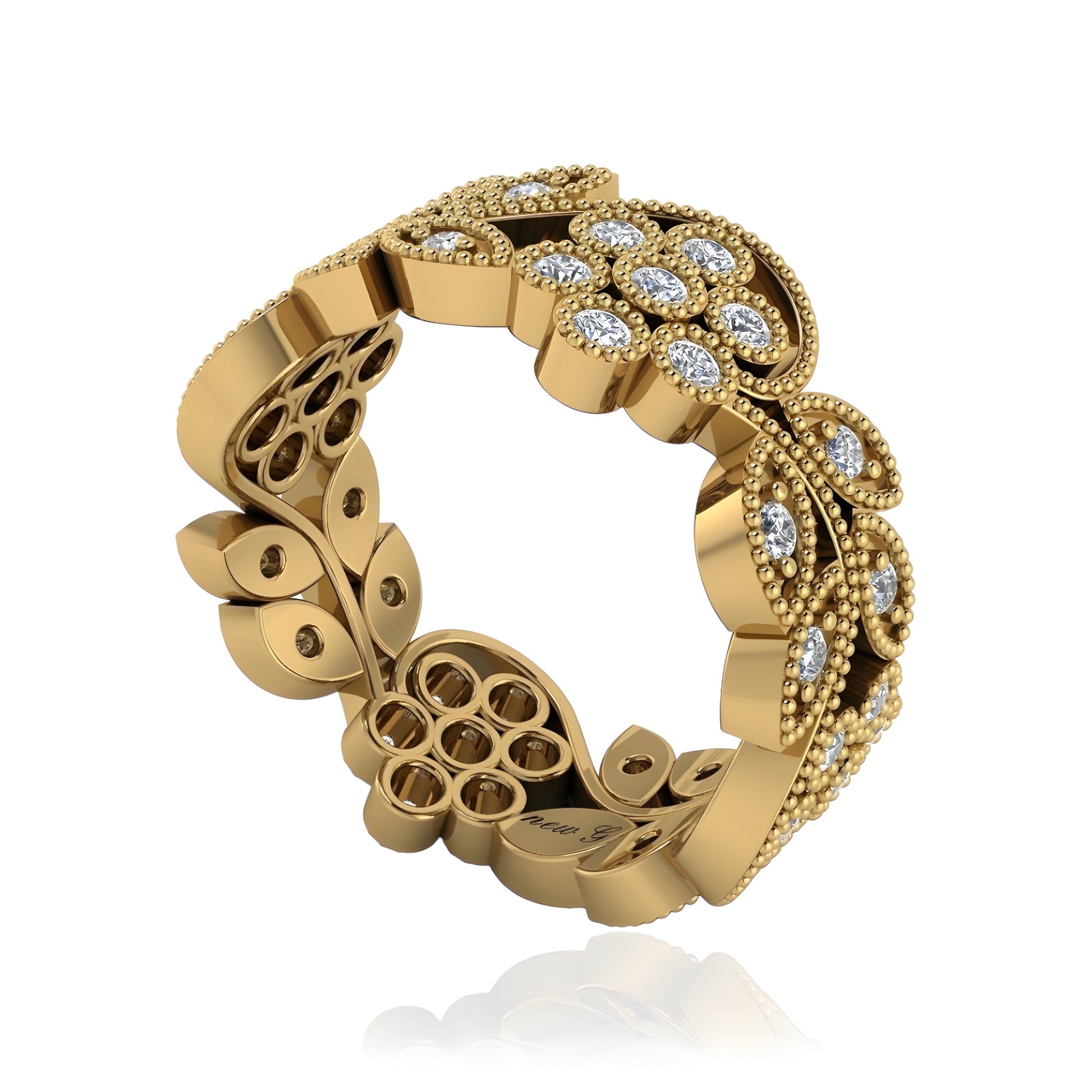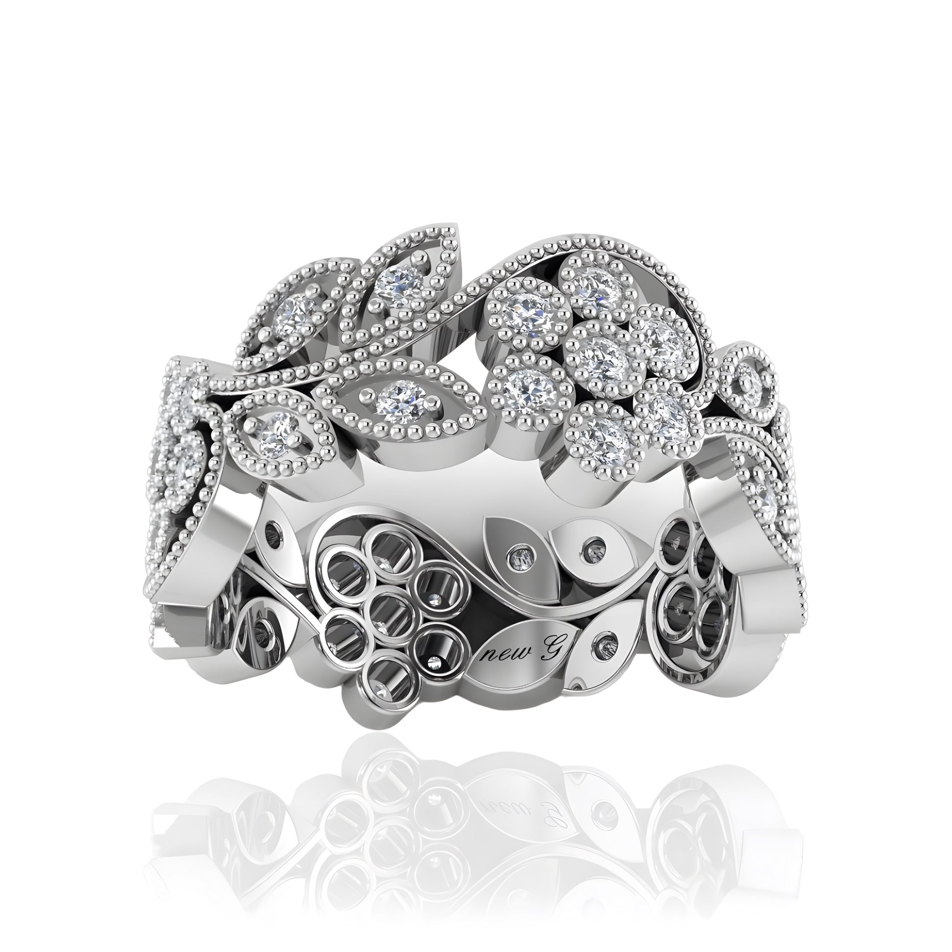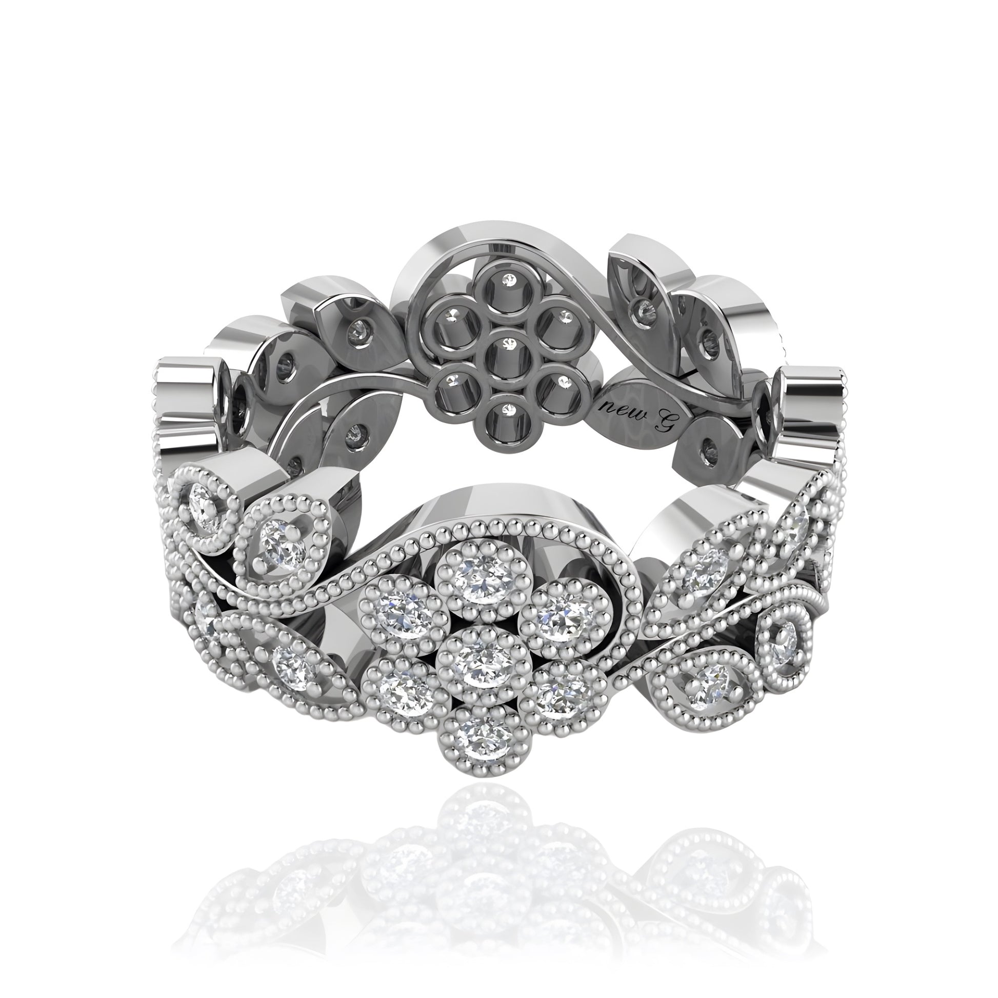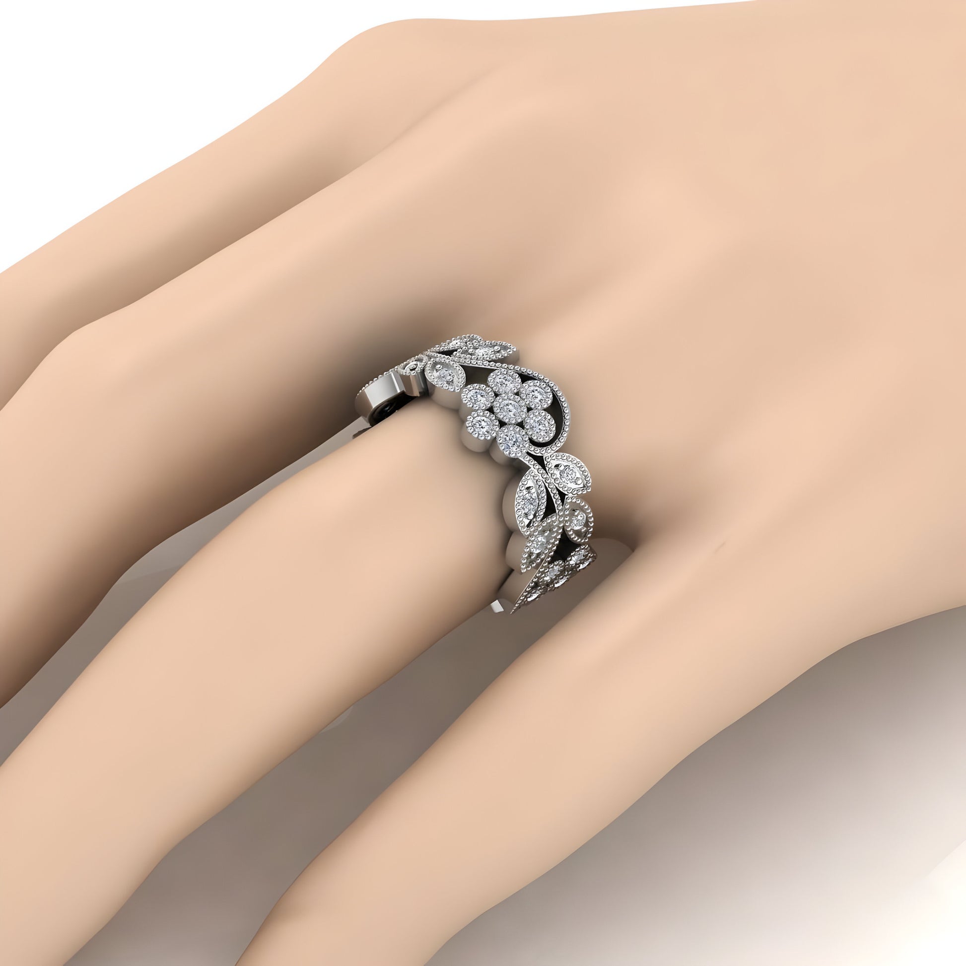This Intricate Diamond Eternity Band is adorned with 44 dazzling diamonds, meticulously set in an elegant floral and vine motif. The detailed craftsmanship highlights the beauty of each diamond, creating a ring that radiates sophistication and charm. This band is available in gold, rose gold, white gold, and platinum, offering a timeless and versatile choice for those who appreciate fine jewelry.