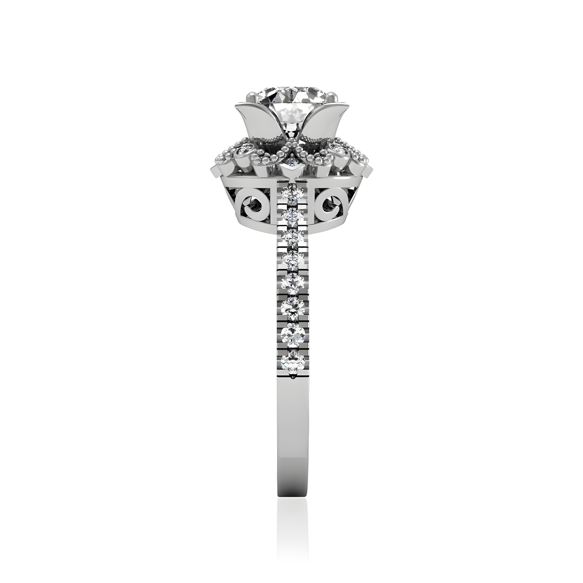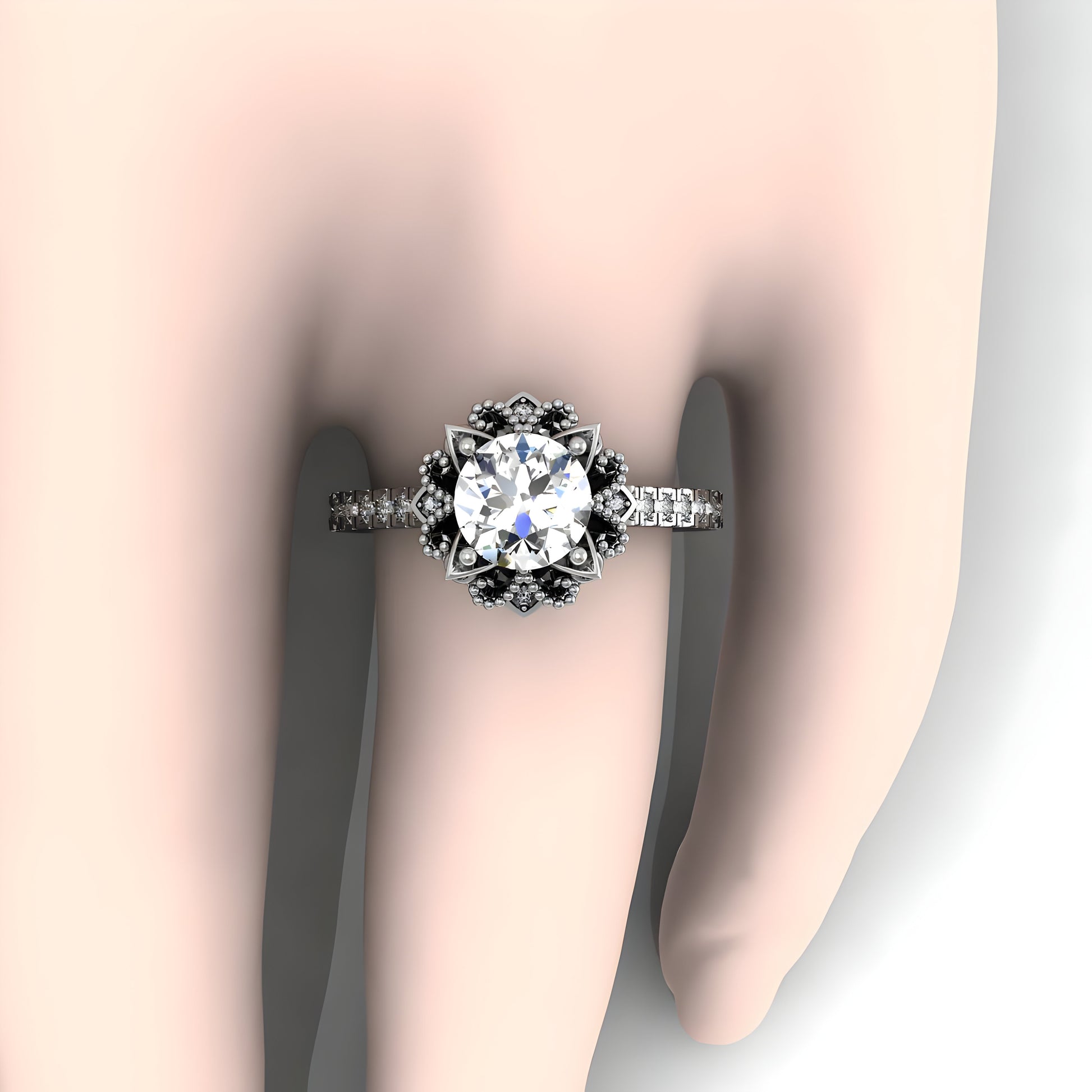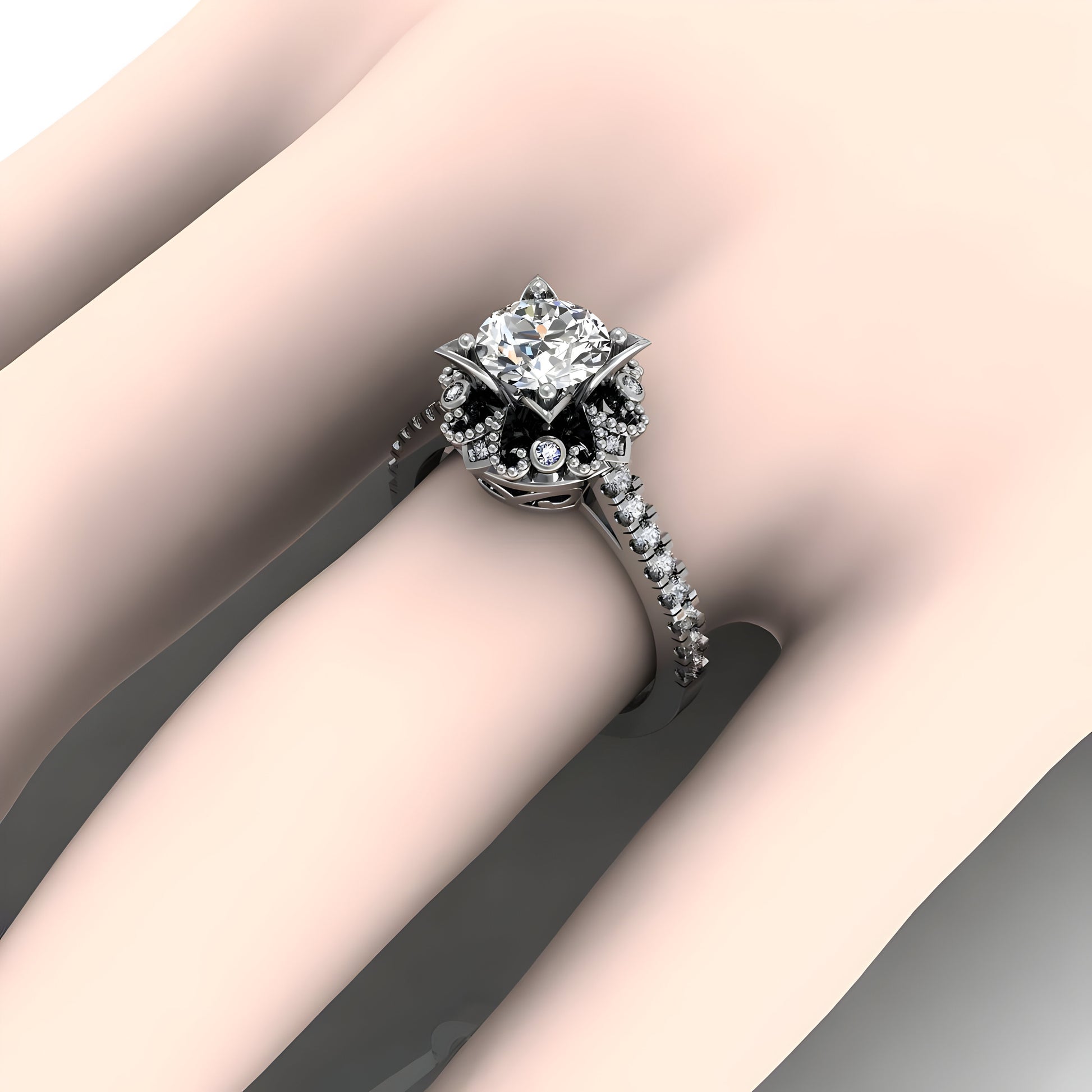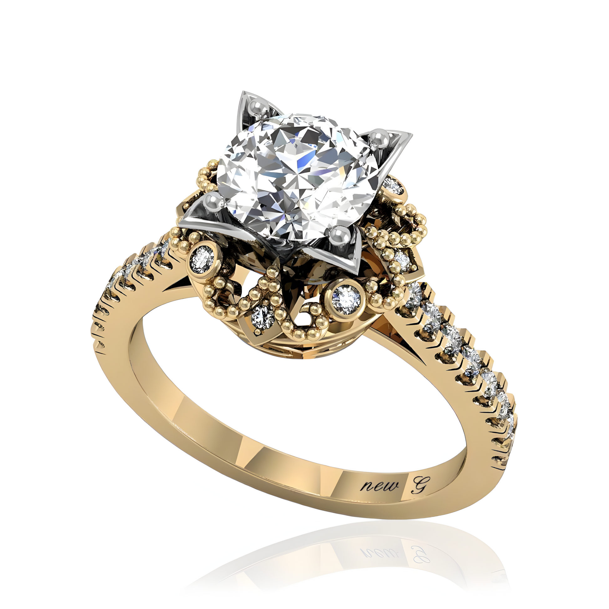 This Ornate Bezel-Set Diamond Ring is a captivating blend of traditional elegance and intricate design. The centerpiece, a brilliant round diamond, is securely held within a unique star-shaped bezel setting, surrounded by delicate milgrain detailing that adds a vintage charm to the ring. The band is further adorned with smaller diamonds, accentuating the central gem and enhancing the ring's overall sparkle. Available in gold, rose gold, white gold, or platinum, this ring offers customers the choice of either a lab-grown diamond or a natural diamond for the main stone, allowing for customization to meet ethical and personal preferences. This ring is perfect for those who seek a distinctive yet timeless piece to symbolize their love.