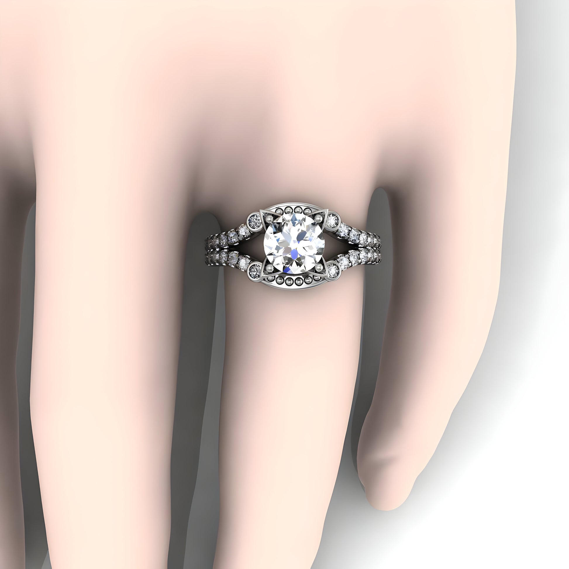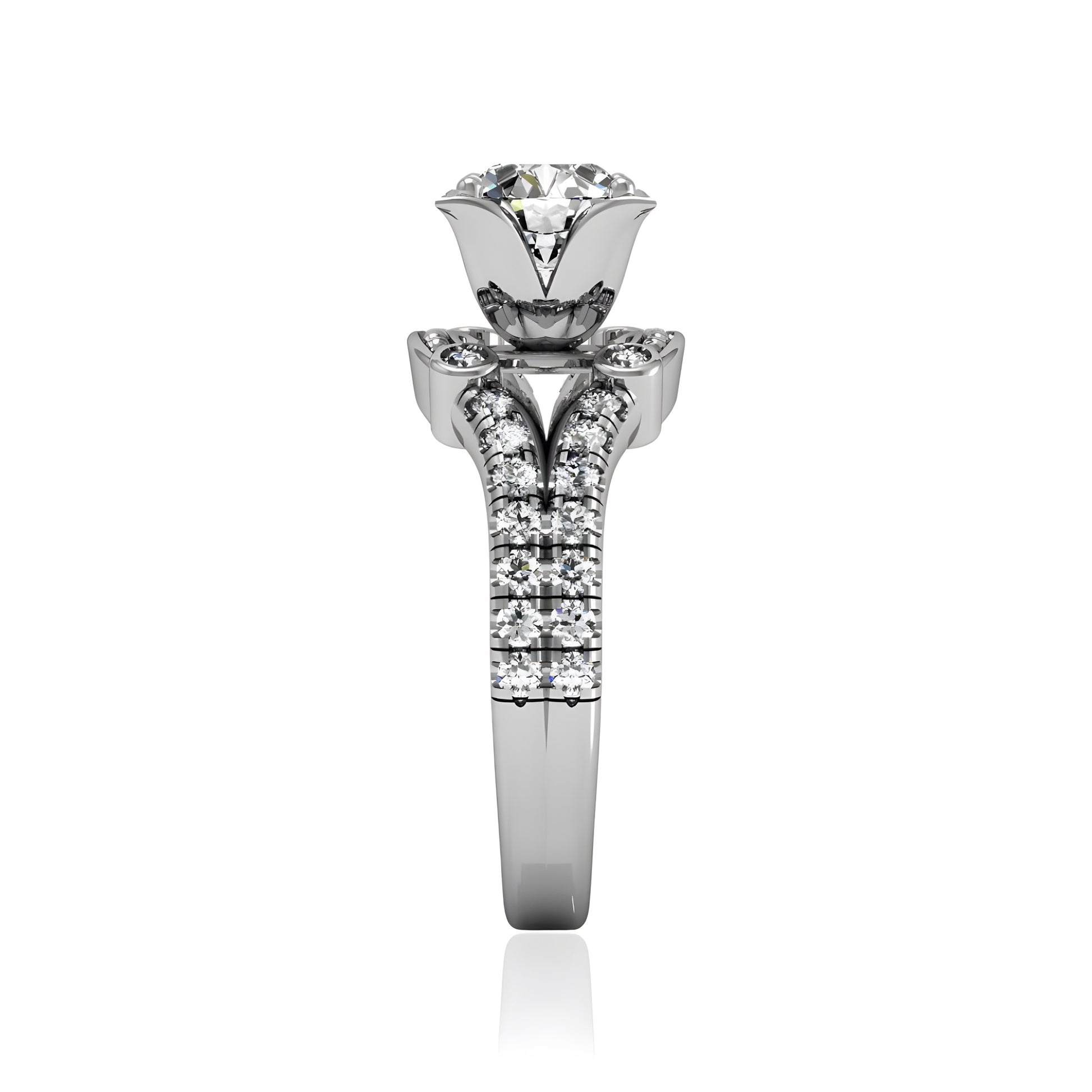 This exquisite diamond ring is a stunning embodiment of natural beauty and craftsmanship. The design showcases a captivating floral motif, with intricately detailed petals that gently cradle the center diamond, creating a harmonious blend of elegance and nature-inspired artistry. The floral accents on the band, each set with shimmering diamonds, add an extra layer of brilliance to this already breathtaking piece.