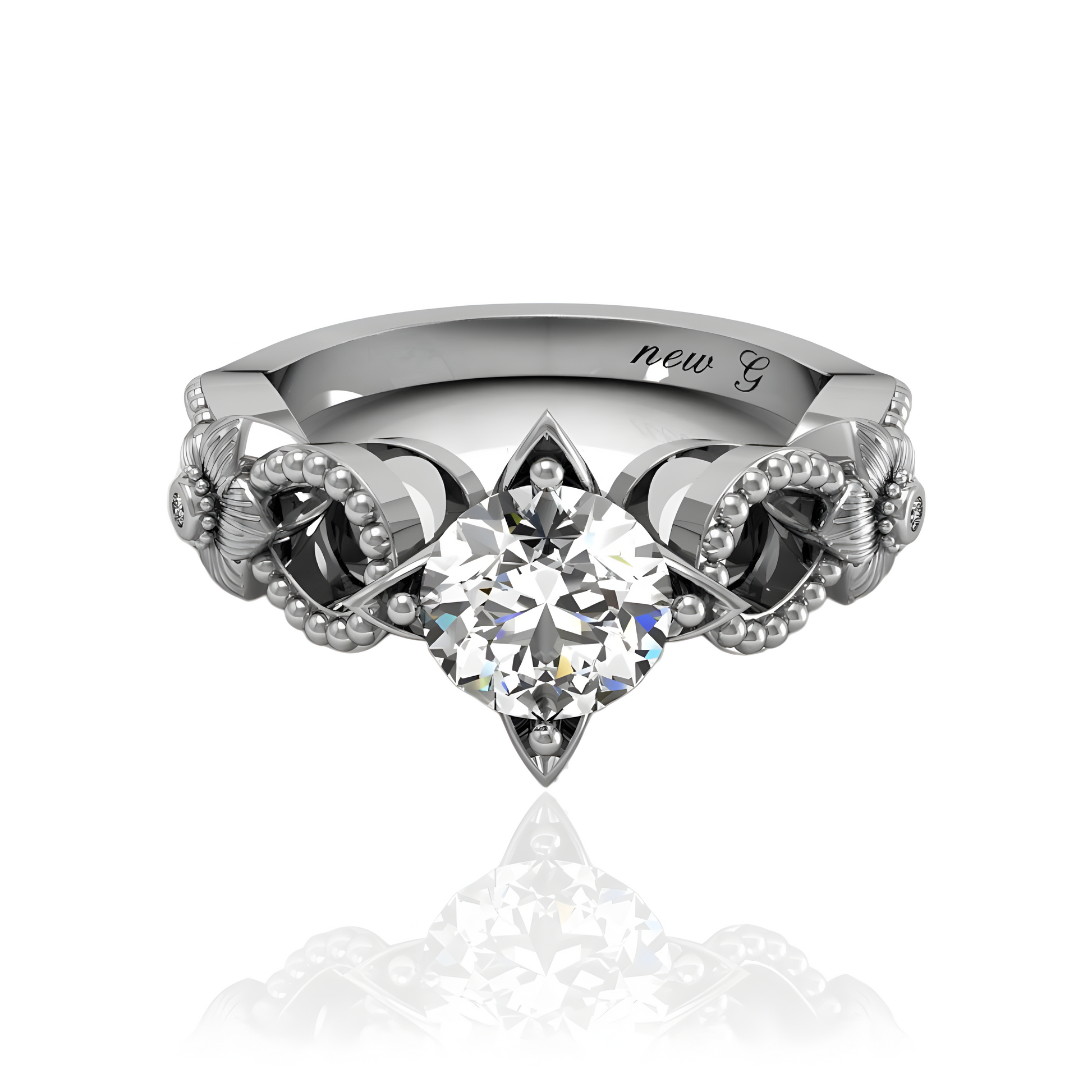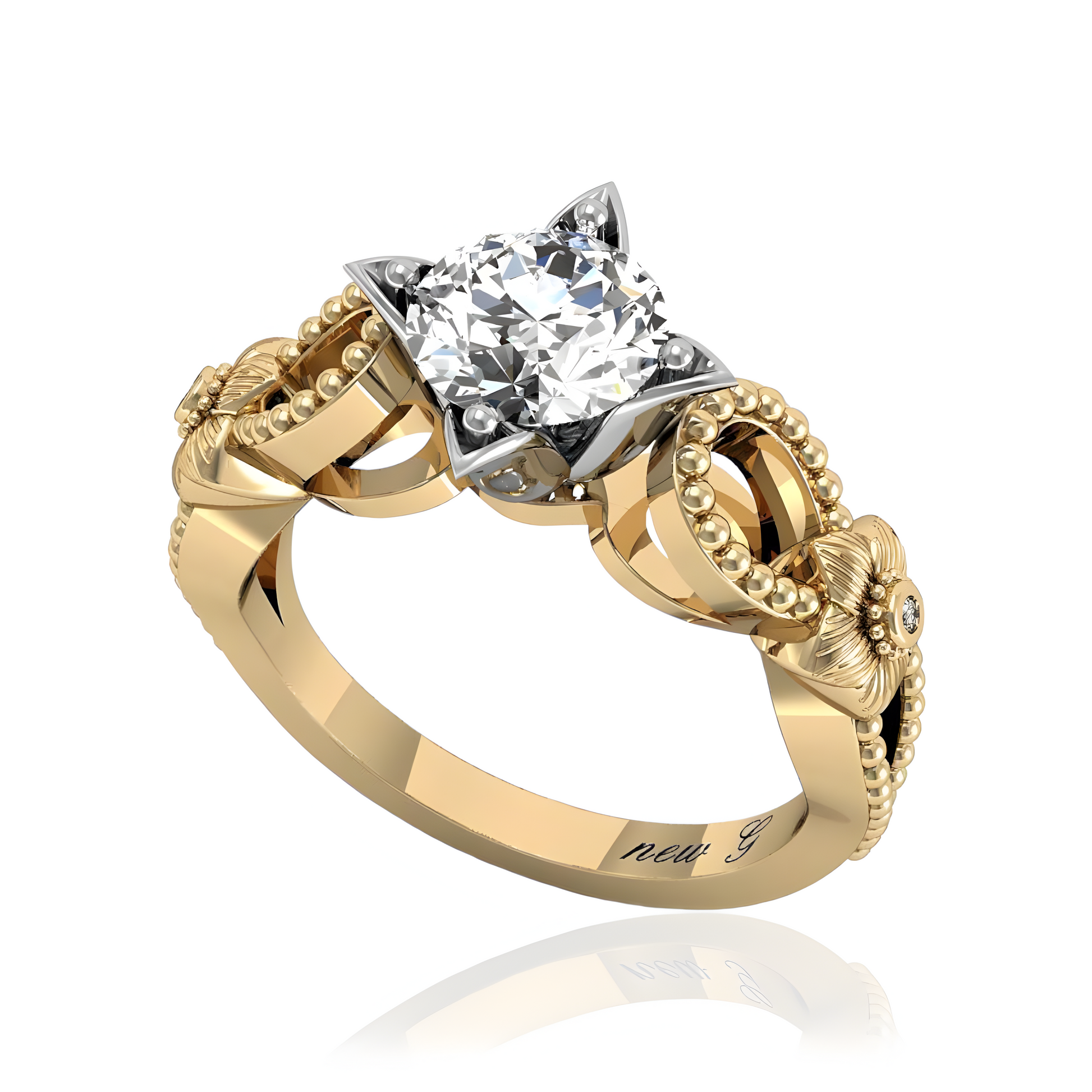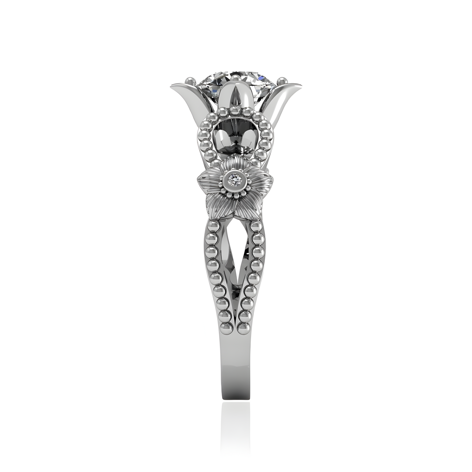 Step back in time with the Vintage Elegance Diamond Engagement Ring, perfect for those who cherish classic beauty with a touch of royal grace. Exquisitely crafted in your choice of gold, rose gold, white gold, or platinum, this ring features intricate filigree and milgrain work along the band, creating a rich, textured backdrop for the stunning central diamond. Available as either a lab-grown diamond for ethical elegance or a natural diamond for traditional luxury, the diamond is showcased in a prominent claw setting, flanked by delicate floral motifs. This ring is a testament to enduring love, imbued with the charm of yesteryears but designed for a lifetime of today's moments.