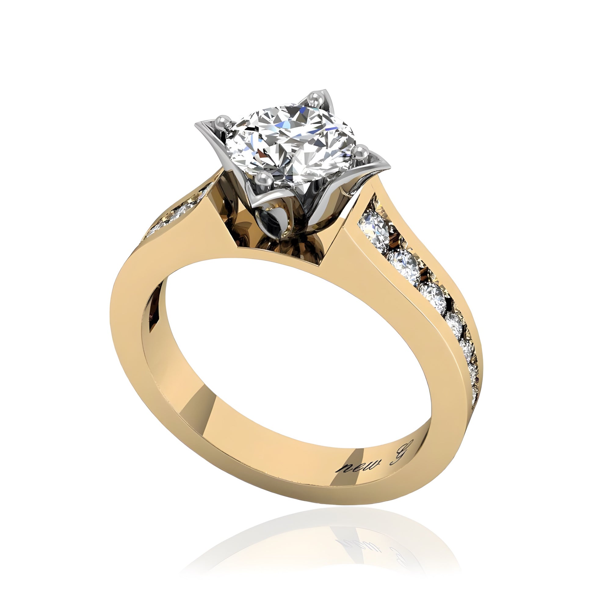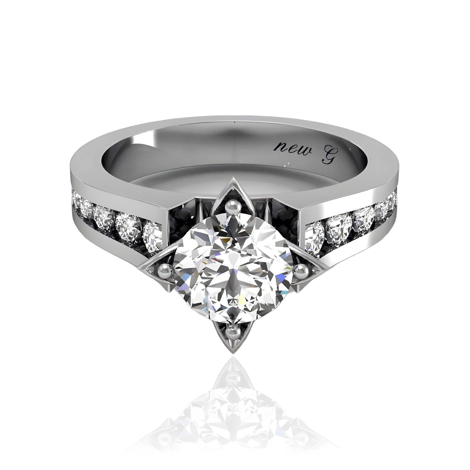 This sophisticated diamond ring showcases a sleek and modern design with channel-set diamonds that gracefully line the band, adding brilliance and elegance to the piece. The central diamond, held securely in a refined prong setting, takes center stage, making a bold statement of timeless beauty.
