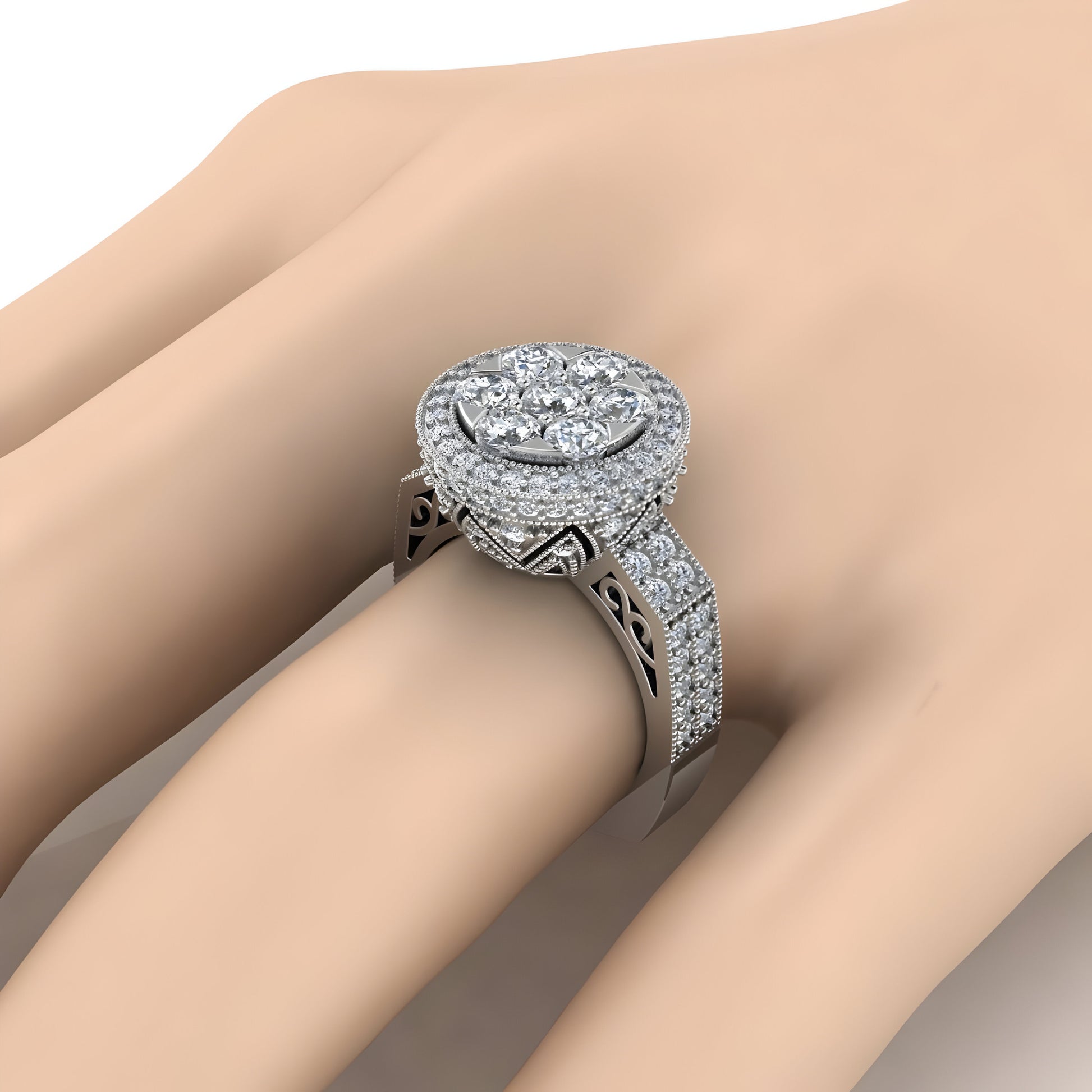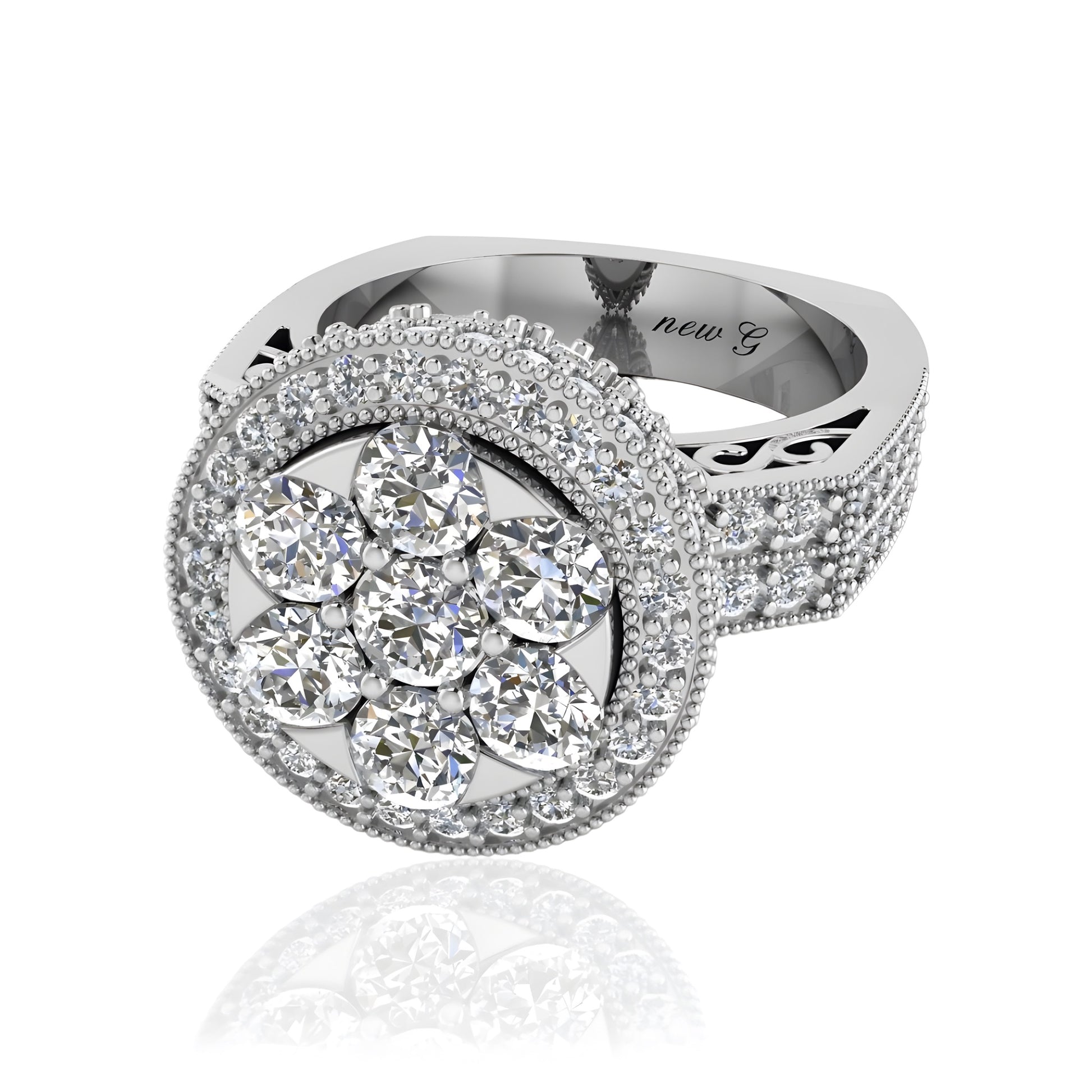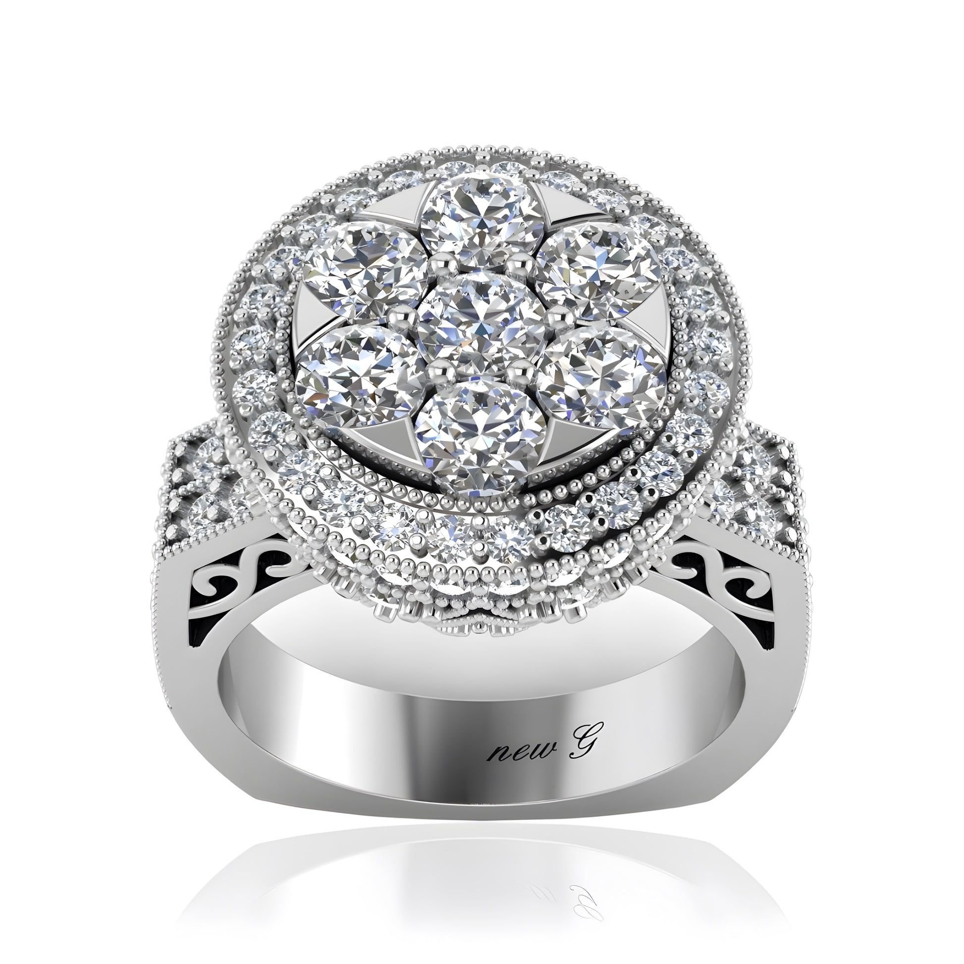 This grand halo diamond ring is a masterpiece of craftsmanship, designed to captivate with its intricate detail and luxurious sparkle. The ring features 107 shimmering sidestones, meticulously set to create a radiant halo effect that enhances the grandeur of the piece. With no center stone, the brilliance of the sidestones and the elaborate metalwork take center stage, making this ring an exquisite symbol of elegance.