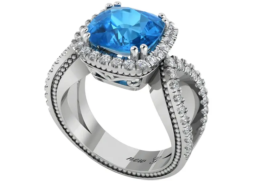 Dive into the serene beauty of the Oceanic Dream Aquamarine Engagement Ring, a stunning piece that captures the tranquil essence of the sea. This ring, available in gold, rose gold, white gold, or platinum, showcases a mesmerizing cushion-cut aquamarine gemstone at its center, radiating a captivating blue hue reminiscent of the ocean's depths. Surrounding the aquamarine is a halo of sparkling diamonds, enhancing the gemstone's natural brilliance. The band features a unique twist design, also encrusted with diamonds, symbolizing the intertwining paths of your love story. With intricate milgrain detailing along the edges, this ring is a perfect blend of modern sophistication and timeless elegance, ideal for those who seek a unique and refreshing symbol of their love.