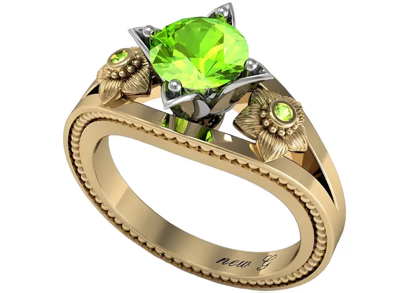 Celebrate the vibrant energy of life with the Verdant Radiance Peridot Engagement Ring, a design that embodies the spirit of renewal and positivity. This exquisite ring, available in gold, rose gold, white gold, or platinum, features a captivating round-cut peridot at its center, showcasing a lively green hue that symbolizes strength and vitality. The peridot is nestled within a floral-inspired setting, with detailed flower motifs on either side of the band, each accented with smaller matching peridot stones. The band is enhanced with intricate milgrain detailing, adding a touch of vintage charm that complements the ring's fresh and invigorating design. Perfect for those who seek a unique and uplifting expression of their love, this ring is a true celebration of life's brightest moments.
