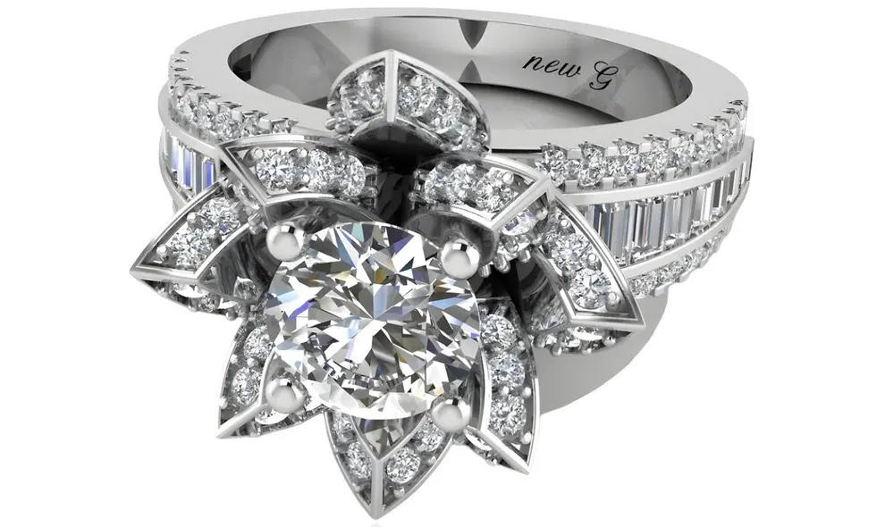 Immerse yourself in the serene beauty of nature with the Lotus Majesty Diamond Engagement Ring, a design that exudes elegance and tranquility. Available in gold, rose gold, white gold, or platinum, this ring showcases a breathtaking lotus flower setting, where each petal is meticulously adorned with brilliant diamonds. The central diamond, offered as a lab-grown diamond for those who cherish sustainability or a natural diamond for its timeless appeal, is cradled at the heart of the lotus, symbolizing purity and enlightenment. The band is further embellished with a combination of round and baguette-cut diamonds, creating a dazzling display of light and luxury that wraps around your finger. This ring is a perfect choice for those who seek a harmonious blend of nature-inspired beauty and exquisite craftsmanship.